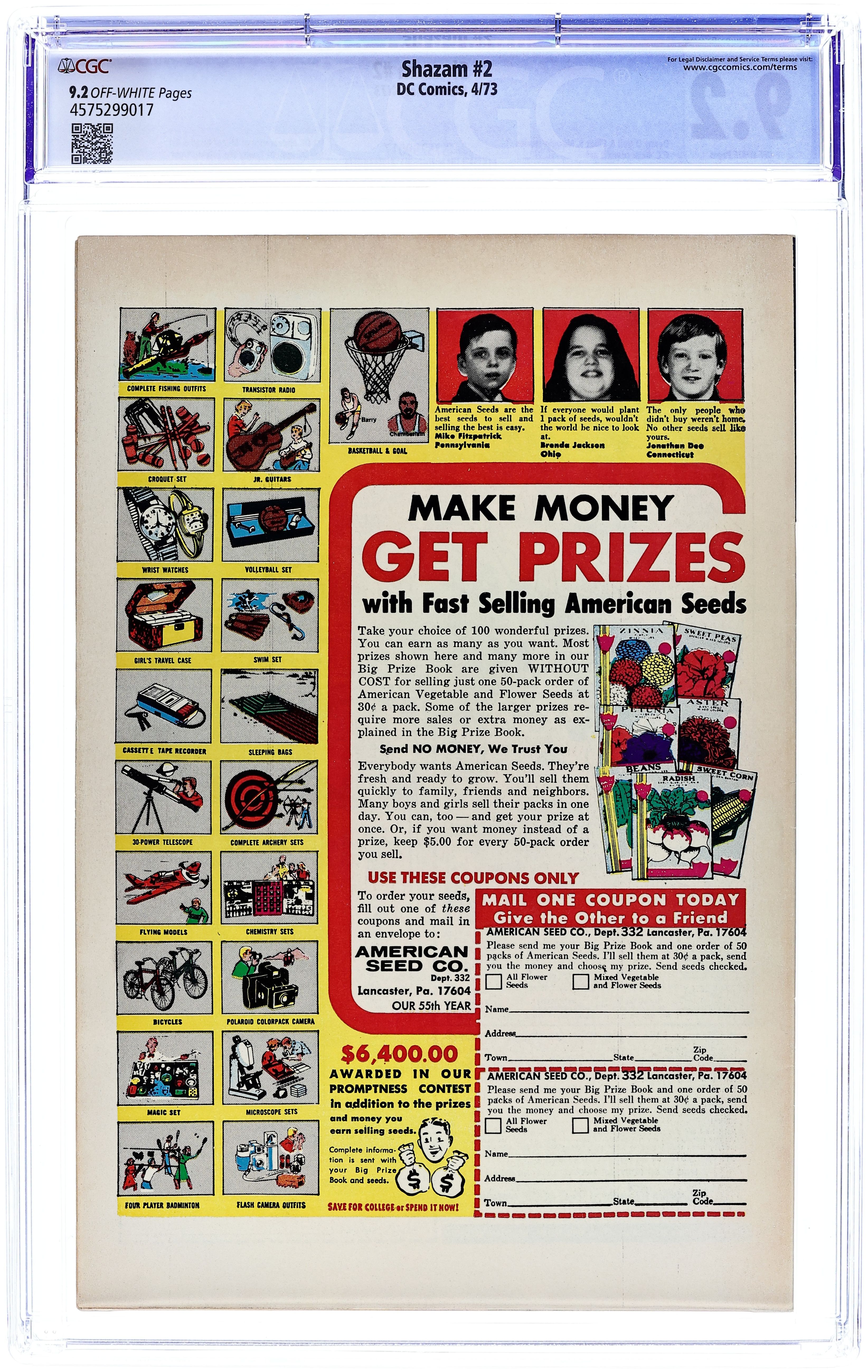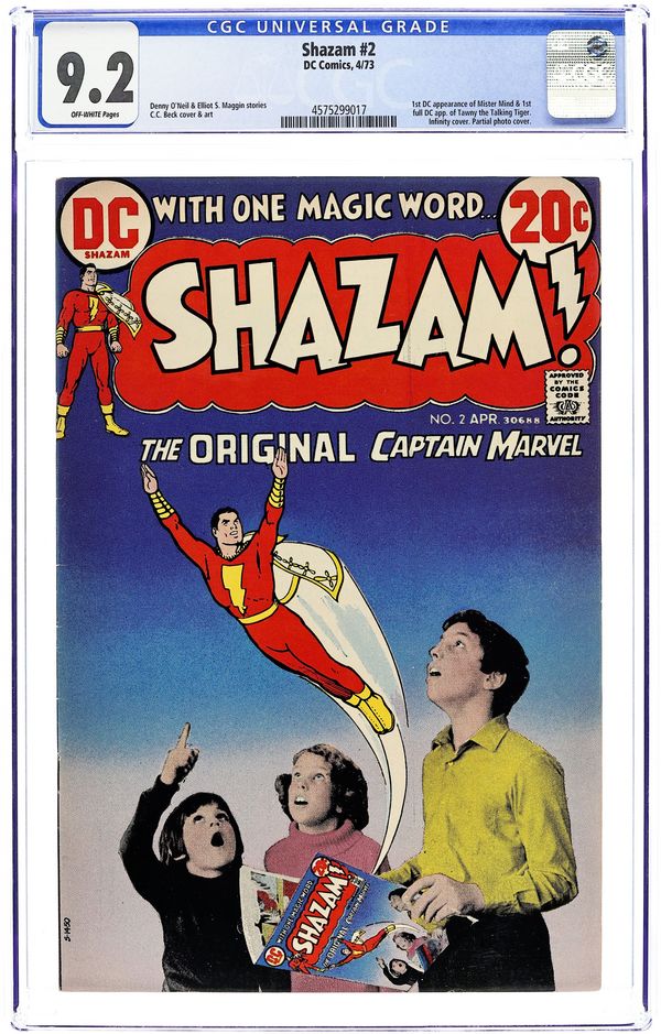 Photo/art cover. Cover by C. C. Beck and Jack Adler. The Astonishing Arch Enemy, script by Denny O'Neil, art by C. C. Beck; Mr. Mind destroys the museum to retrieve his glasses that were stored there; He plans to destroy the United States but is stopped by Captain Marvel with the help of the Saint Louis Arch, which he uses as a tuning fork to drive all the worms in the area to the surface. The Nicest Guy in the World, script by Elliot S! Maggin, art by C. C. Beck; Bank robbers give Sunny Sparkle their loot. Reprint back-up: "The Original Captain Marvel Fights Niatpac Levram!" (that's Captain Marvel spelled backward!) from Captain Marvel Adventures 139 in 1952, script by Otto Binder, art by C. C. Beck. One-page text feature about the history of the Marvel Family. 36 pgs., full color. $0.20. Cover price $0.20. Grade: CGC 9.2 explanation of grade Condition: Used (collectible)