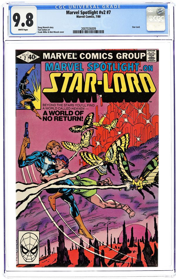 Marvel Spotlight on Star-Lord - "Tears For the World Called Heaven!" Written by Doug Moench. Art by Tom Sutton. Cover by Frank Miller and Bob Wiacek. Beyond the stars you'll find a world called Heaven - a world of no return! 32 pages, FC. NOTE: Last 40-cent cover price. Cover price $0.40. Grade: CGC 9.8 explanation of grade Condition: Used (collectible)