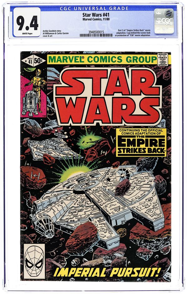 Direct Edition. The Empire Strikes Back: Part 3 of 6. "Imperial Pursuit!" Script by Archie Goodwin, art by Al Williamson and Carlos Garzon. Note: Part 3 of movie adaptation; based on the movie script; Williamson and Garzon both pencil and ink the art for this series. Plus: 5-page text article "Building an Empire--Marvel Style." Cover by Williamson and Garzon. Cover price $0.50. Grade: CGC 9.4 explanation of grade Condition: Used (collectible)