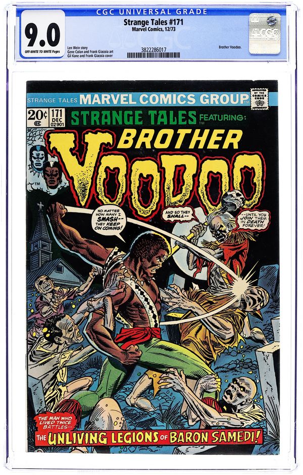 Cover pencils by Gil Kane, inks by Frank Giacoia. "March of the Dead," script by Len Wein, pencils by Gene Colan, inks by Frank Giacoia; Brother Voodoo has been summoned to Haiti to investigate reports of Zuvembies attacking factories across the island; Going to a local grave yard he is attacked by these apparent undead soldiers and their leader: Baron Samdei; During the fight, Brother Voodoo is knocked out; While he is unconscious he reflects back on the events that brought him to Haiti, and of the Zuvembie that was in captivity of the local authorities. Ad for Astonishing Tales # 21. 36 pgs., full color. Cover price $0.20. Grade: CGC 9.0 explanation of grade Condition: Used (collectible)