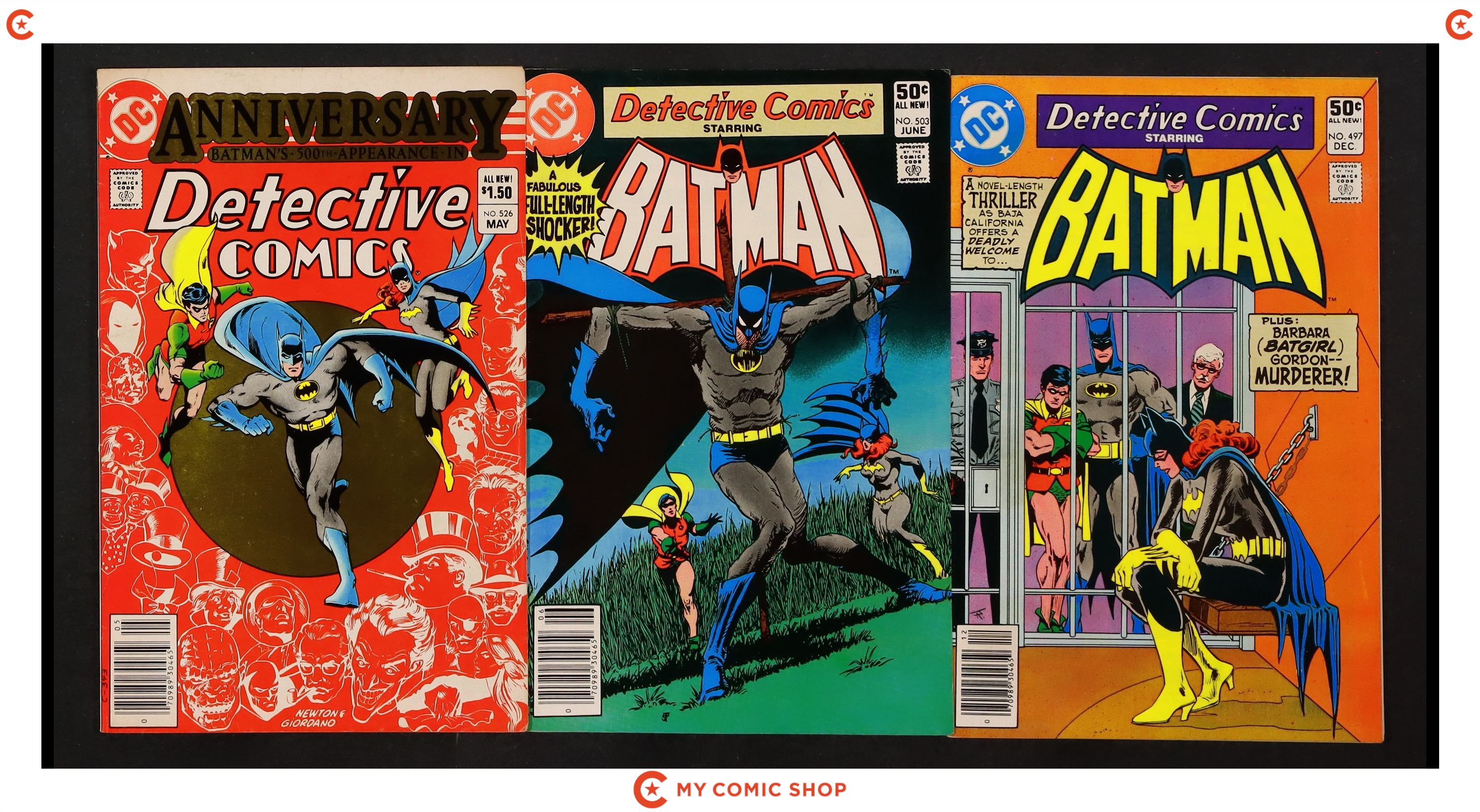 Issues 457, 468, 475, 496, 497N, 503, and 526 of Detective Comics (1937 1st Series). Most will grade in the FN range with #457 and $468 grading GD, and #475 grading PR (INCOMPLETE. Missing Pages, Effects art and story).