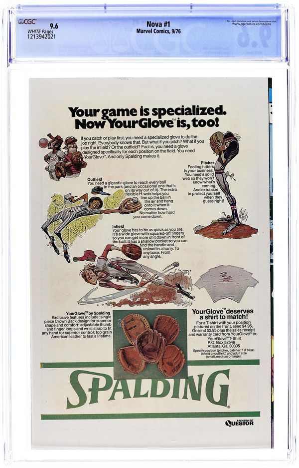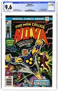 Written by Marv Wolfman. Pencils by John Buscema. Inks Joe Sinnott. When a dying alien passes on his super-powers to Earth teenager Richard Rider, Rider becomes the man called Nova, the human rocket! In the marvelous tradition of Spider-man, Nova must now stop the murderous alien known as Zorr, or Earth is doomed! Note: First appearance of Nova. 36 pages, full color. Cover price $0.30. Grade: CGC 9.6 explanation of grade Condition: Used (collectible)