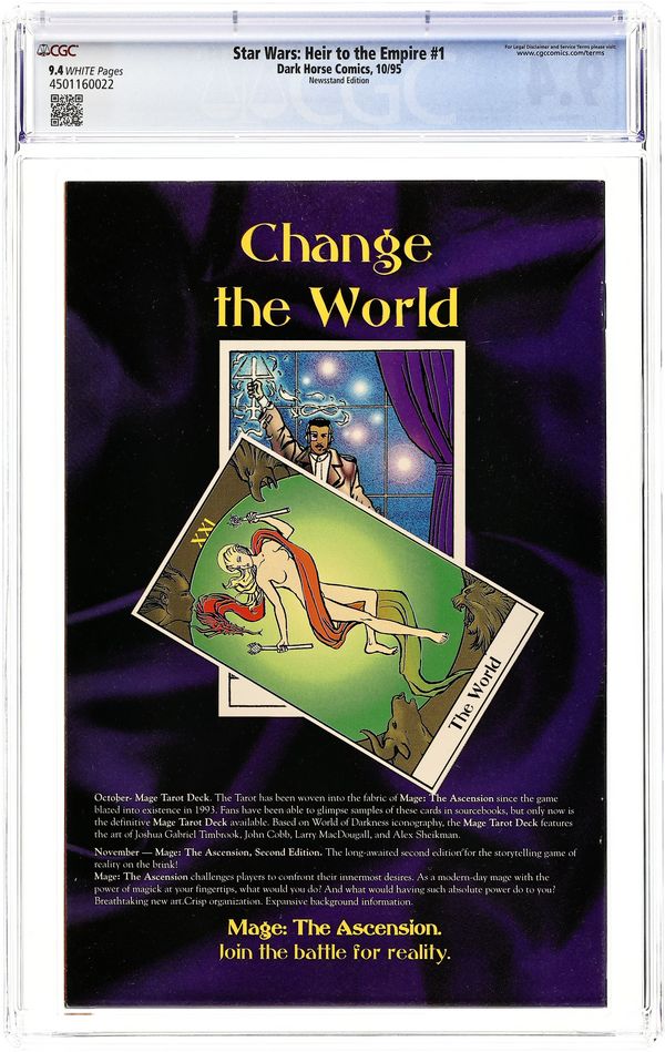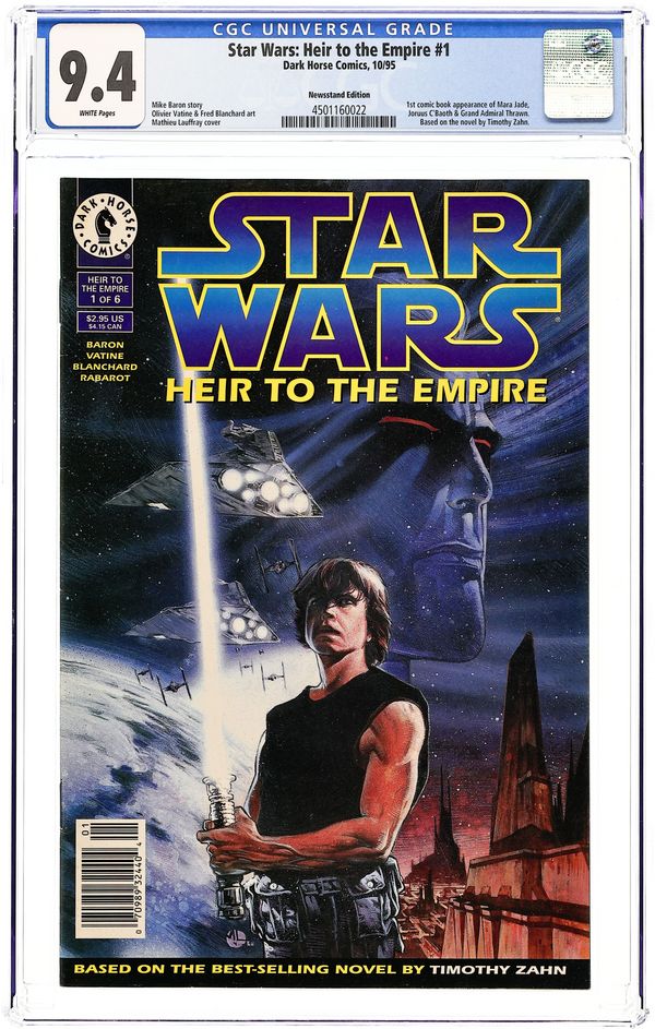 Newsstand Edition. Written by Mike Baron. Art by Olivier Vatine and Fred Blanchard. Cover by Mathieu Lauffray. The tyranny has ended. But what will take its place? It is now five years after Return of the Jedi. Leia and Han are married and have shouldered heavy burdens in the government of the New Republic. And Luke Skywalker is the first in a hoped-for new line of Jedi Knights. But thousands of light-years away, the last of the Emperor's warlords, Grand Admiral Thrawn, has taken command of the remains of the Imperial fleet. Thrawn has made two vital discoveries that could destroy the Rebel Alliance's New Republic. The tale that emerges is a towering epic of action, invention, mystery, and a spectacle of galactic scale -- in short, a story that is worthy of the name Star Wars. 32 pages, FC. Cover price $2.95. Grade: CGC 9.4 explanation of grade Condition: Used (collectible)