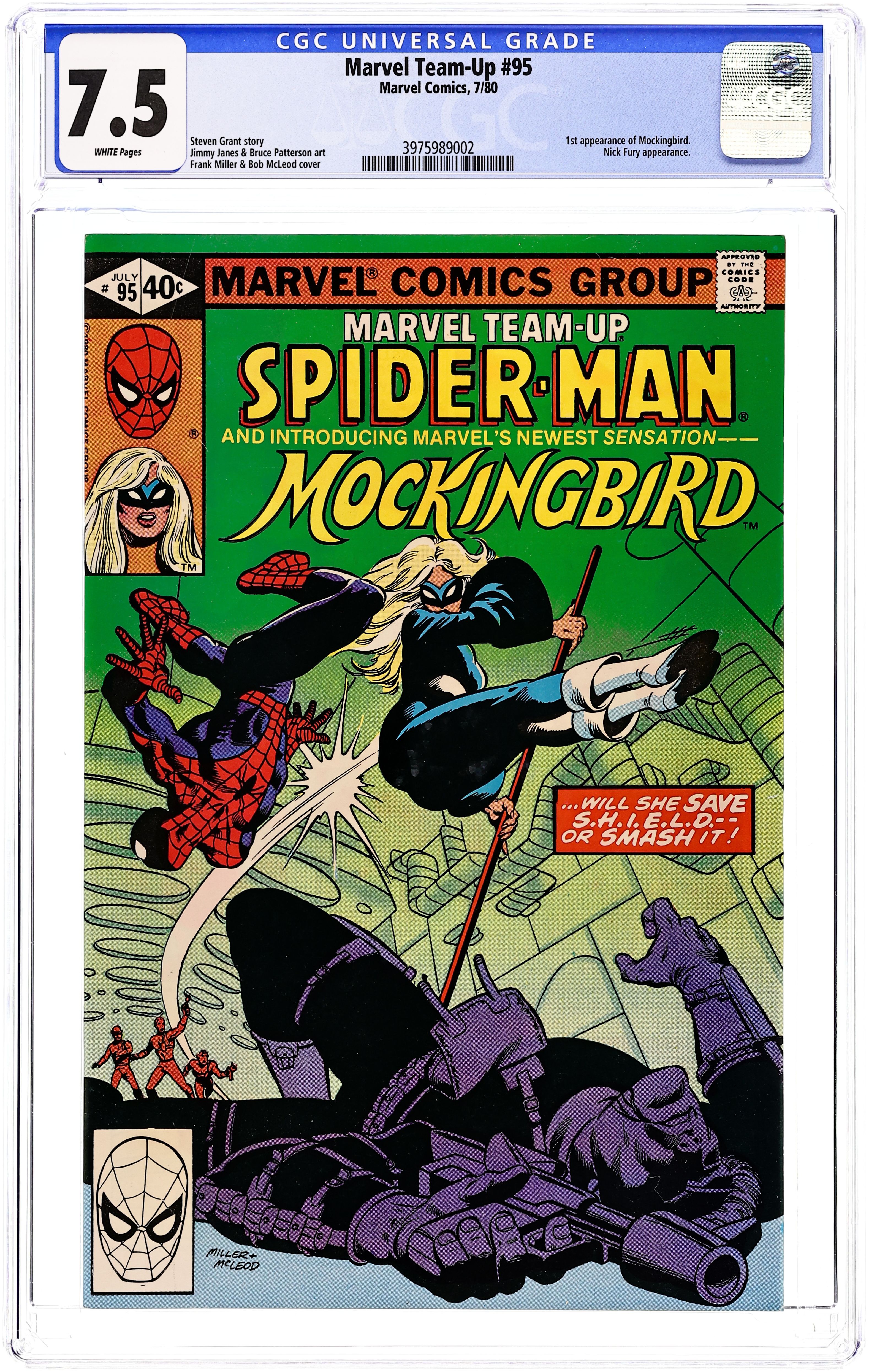 Direct Edition. "And No Birds Sing!" Guest-starring Spider-Man and Mockingbird (1st appearance). Script by Steven Grant. Art by Jimmy James (breakdowns) and Bruce Patterson (finishes). Cover by Frank Miller and Bob McLeod. A rogue SHIELD branch director tricks the web-slinger into believing that Nick Fury's life is in jeopardy! Specifically, from a former SHIELD operative...Barbara Morse! However, Mockingbird is actually trying to save Nick Fury. Will Spider-Man realize that in time? First appearance of Bobbi Morse as Mockingbird. (Notes: After a cameo appearance in Contest of Champions 1, Mockingbird appears next in the first Hawkeye Limited Series published in 1983. The letters page contains a brief essay from Mark Gruenwald about the creation of Mockingbird.) 36 pages. Cover price $0.40. Grade: CGC 7.5 explanation of grade Condition: Used (collectible)