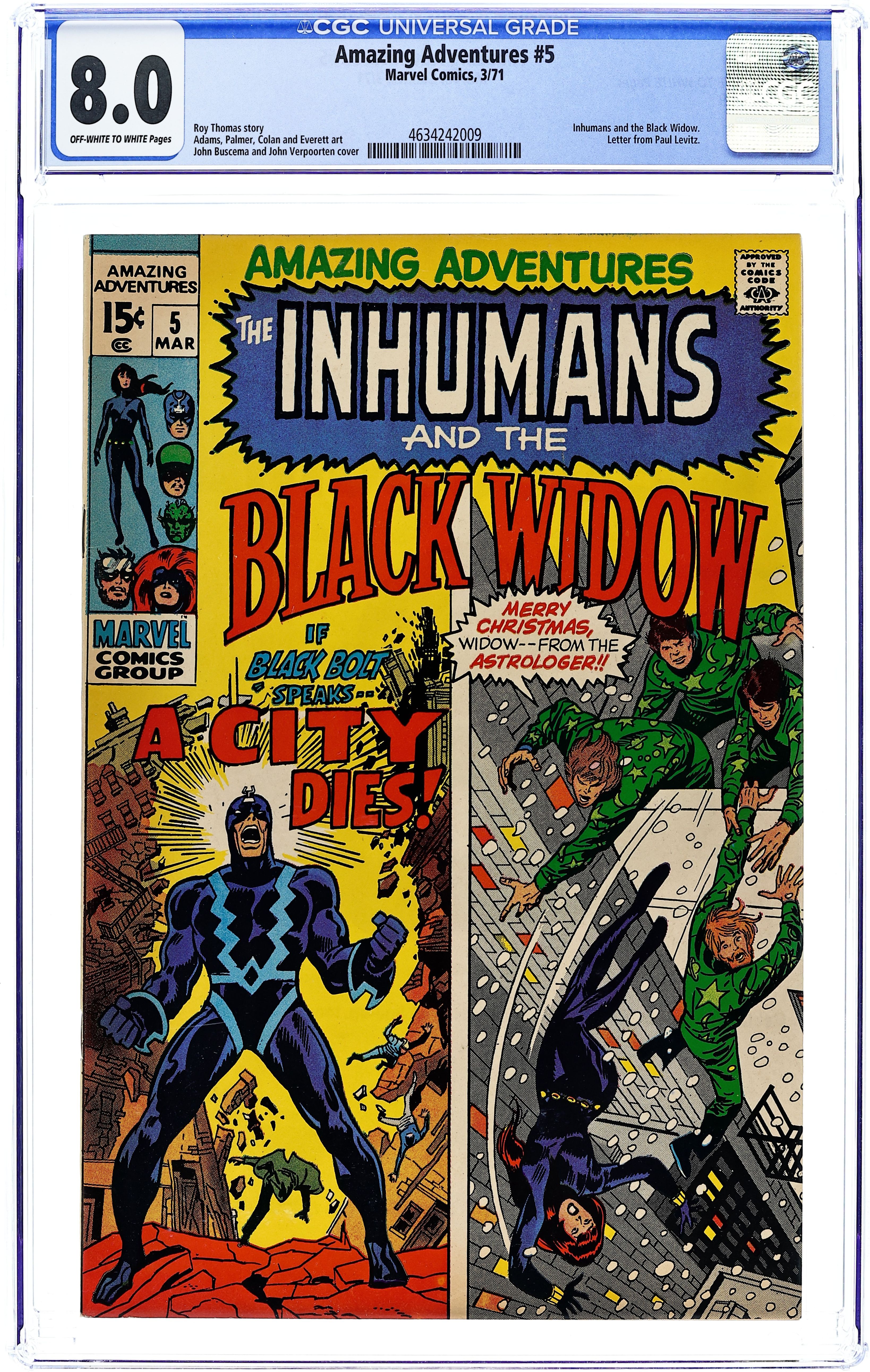 Starts Dec 15 Cover pencils by John Buscema, inks by John Verpoorten. "His Brother's Keeper!", script by Roy Thomas, pencils by Neal Adams, inks by Tom Palmer; Black Bolt realizes that Maximus has gained the power to blank men's minds and thus encases him within a stasis container and then leaves for America; The first group of people he comes across are criminals who are attempting to get a small boy to climb in through a building window and unlock it to burglarize it; Black Bolt easily defeats the criminals and aids the injured boy; Meanwhile, Gorgon and Karnak think their leader has gone too far in entombing Maximus and attempt to free him. "And To All a Good Night," script by Roy Thomas, pencils by Gene Colan, inks by Bill Everett; The Astrologer's goons are after a hippie from Utah, who knocks the Astrologer's henchmen who was attacking the Black Widow off a building with him. Letter to the editor from comic editor Paul Levitz. 36 pgs, full color. $0.15. Cover price $0.15. Grade: CGC 8.0 explanation of grade Condition: Used (collectible)