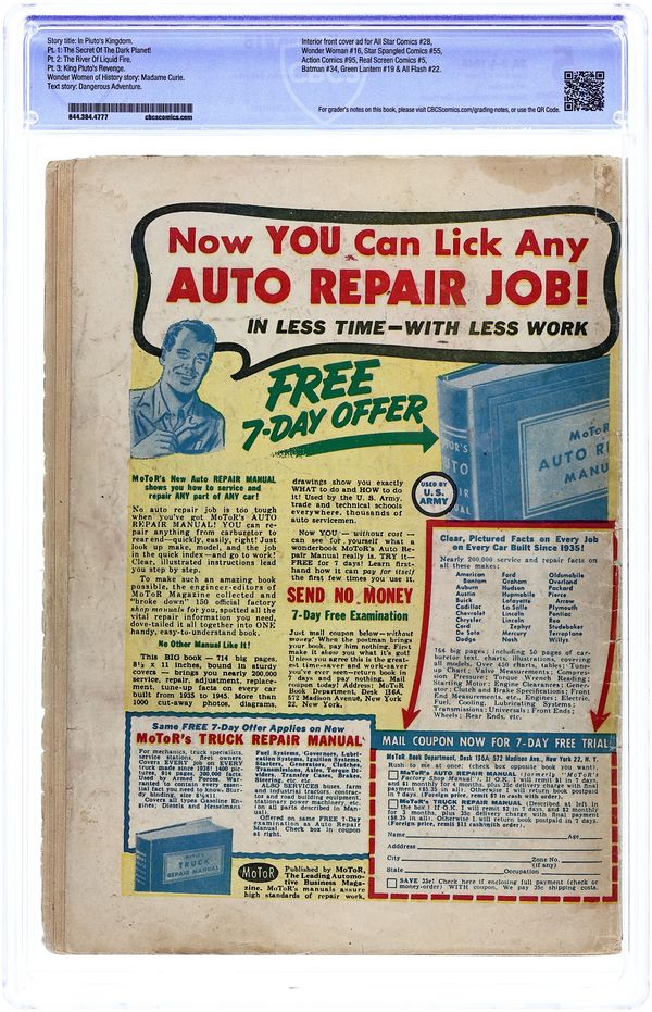 Cover by Harry G. Peter. "In Pluto's Kingdom Part 1: The Secret of the Dark Planet," script by Joye Hummel (as Charles Moulton), art by Harry G. Peter; After a Holliday girl is abducted by King Pluto, Wonder Woman and the Holliday girls travel to the furthest planet, where the king extracts their "color bodies" to light his gloomy planet and attempts to melt Wonder Woman like a color tablet. "In Pluto's Kingdom Part 2: The River of Liquid Fire," script by Joye Hummel (as Charles Moulton), art by Harry G. Peter; Wonder Woman and her girls pierce Pluto's underworld and fight off his forces to retrieve their "dark earth" bodies, while Pluto escapes to mount an assault on Earth. Wonder Women of History: four-page Madame Curie bio, script by Alice Marble, art by Alfonso Greene. Two-page text story, "Dangerous Adventure" by Jim Robinson. "In Pluto's Kingdom Part 3: King Pluto's Revenge," script by Joye Hummel (as Charles Moulton), art by Harry G. Peter; Pluto kidnaps Steve and extorts a dynamo from Wonder Woman, intending to light his gloomy kingdom forever and let his kidnapped girls burn out. 52 Pages, Full Color. Cover price $0.10. Grade: CBCS 0.5 explanation of grade Condition: Used (collectible)