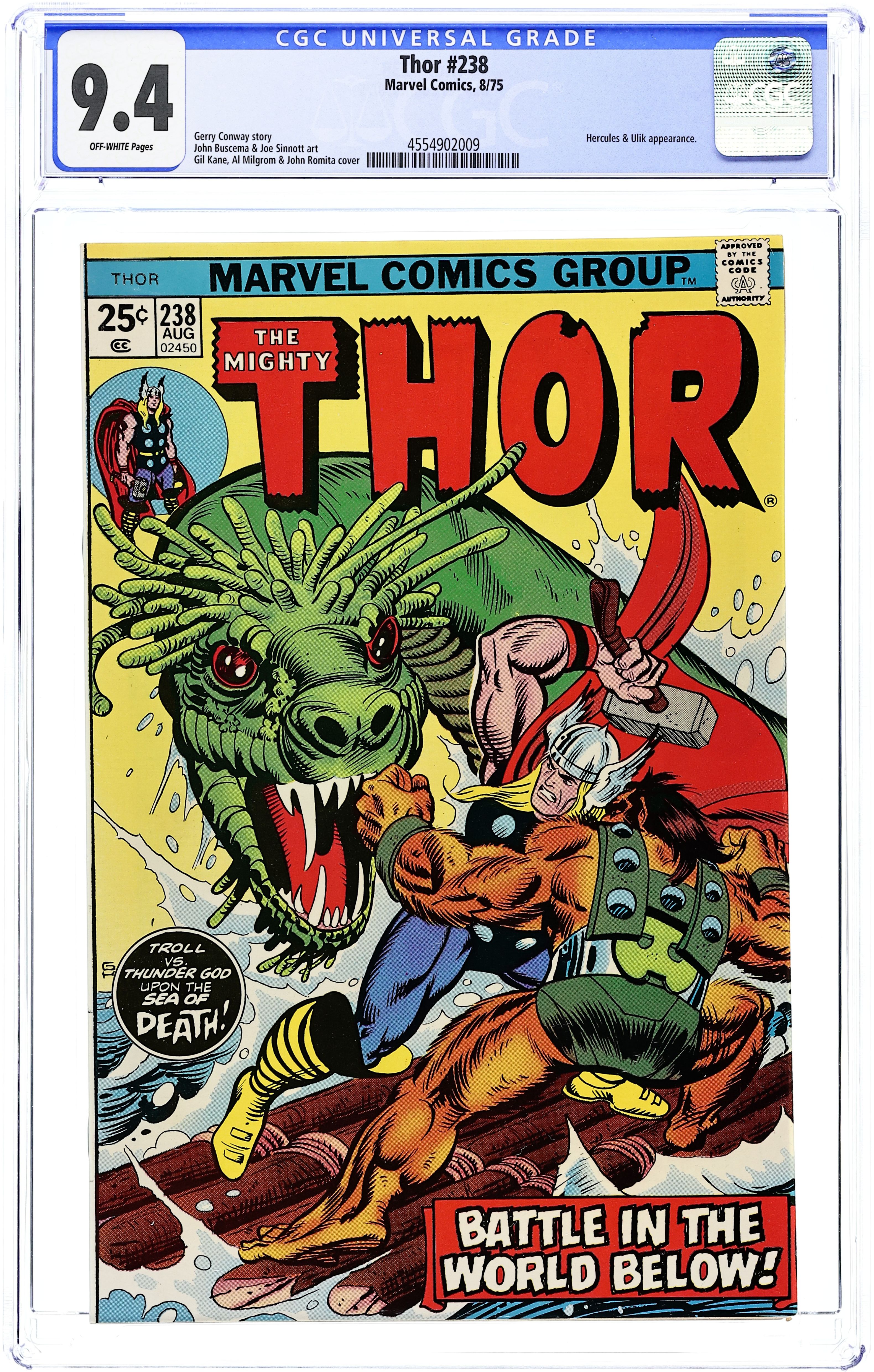 Cover pencils by Gil Kane and John Romita (alterations), inks by Al Milgrom (signed) and John Romita (alterations). "Night of the Troll!", script by Gerry Conway, layouts by John Buscema, finished art by Joe Sinnott; Ulik leads Thor to an underground river; Elsewhere, Orrin gets involved in a grape picker's strike; Back in the caverns, Ulik tells Thor his plan; He wants Thor to take care of Zotarr, while he attacks Geirrodur; During the battle, it is Jane that sneaks up and captures Geirrodur, with his own spear. The letters page contains Marvel Value Stamp #94 (Electro by Steve Ditko). 36 pgs., full color. $0.25. Cover price $0.25. Grade: CGC 9.4 explanation of grade Condition: Used (collectible)