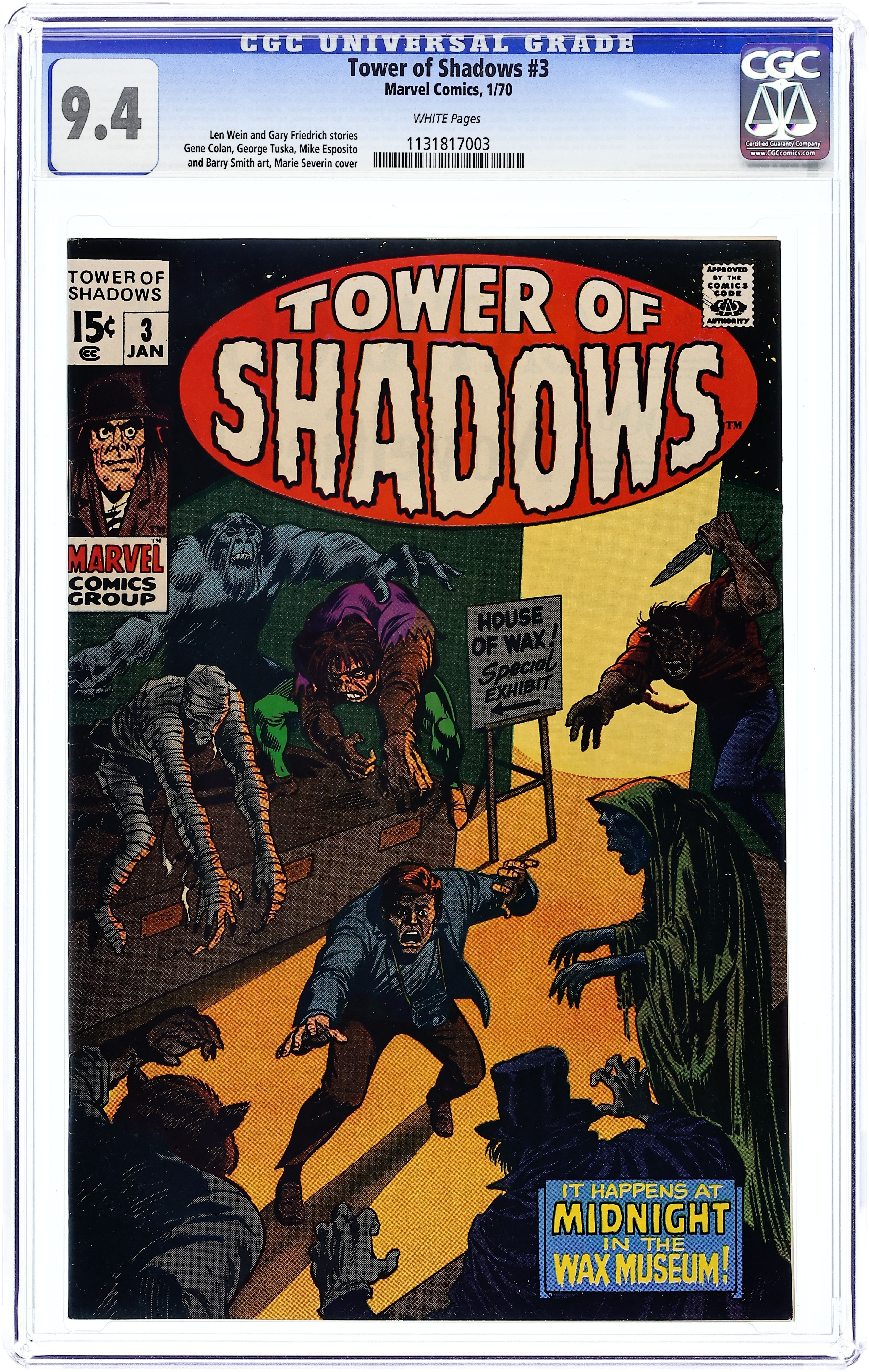 All new stories. "The Terrible Old Man!" Script by Roy Thomas, pencils by Barr Windsor-Smith, inks by John Verpoorten and Dan Adkins. "The Moving Finger Writhes!" Script by Len Wein, pencils by Gene Colan, inks by Joe Gaudioso. "Midnight in the Wax Museum!" Script by Gary Friedrich, art by George Tuska. Cover price $0.15. Grade: CGC 9.4 explanation of grade Condition: Used (collectible)