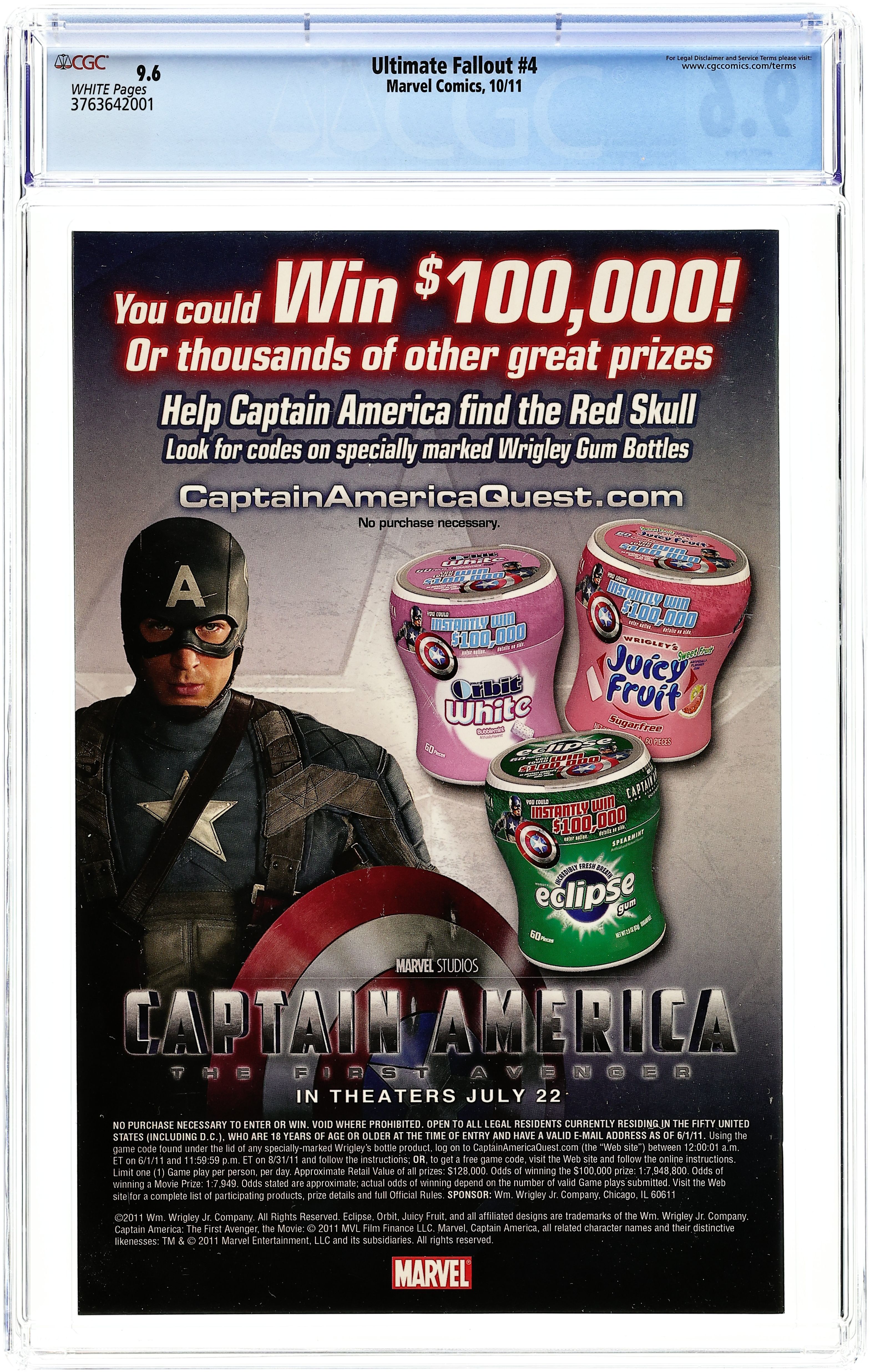 Direct Edition. 1st appearance of Miles Morales. Written by BRIAN BENDIS, JONATHAN HICKMAN & NICK SPENCER. Art by SARA PICHELLI, SALVADOR LARROCA & CLAYTON CRAIN. Cover by MARK BAGLEY. What will become of Captain America? Where have all the X-Men gone? And what is up with the new Spider-Man suit? Don't miss the final chapters of one of the most talked about Ultimate events ever. 36 PGS. (each)/Rated T+...$3.99 (each) Cover price $3.99. Grade: CGC 9.6 explanation of grade Condition: Used (collectible)