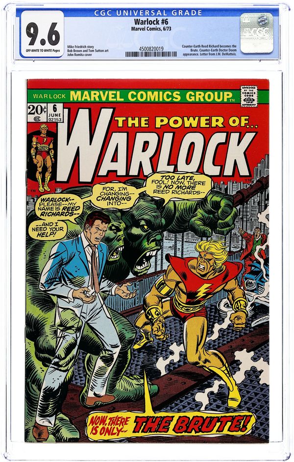 Cover by John Romita. "The Brute!", script by Roy Thomas, Ron Goulart, and Mike Friedrich, pencils by Bob Brown, inks by Tom Sutton; Warlock walks straight into a trap set by Astrella; There, Warlock encounters the Brute, a former human trapped in a monsters body; When Warlock discovers a way to revert the Brute to human form, his true identity is revealed. Introducing Reed Richards of Counter-Earth!; Guest starring Counter-Earth's Reed Richards and Victor Von Doom; First appearance of Counter-Earth's Sue Storm, Johnny Storm, and Ben Grimm. Letters to the editor from comics writer Marc DeMatteis and Dean Mullaney (Eclipse Comics). 36 pgs., full color. $0.20. Cover price $0.20. Grade: CGC 9.6 explanation of grade Condition: Used (collectible)