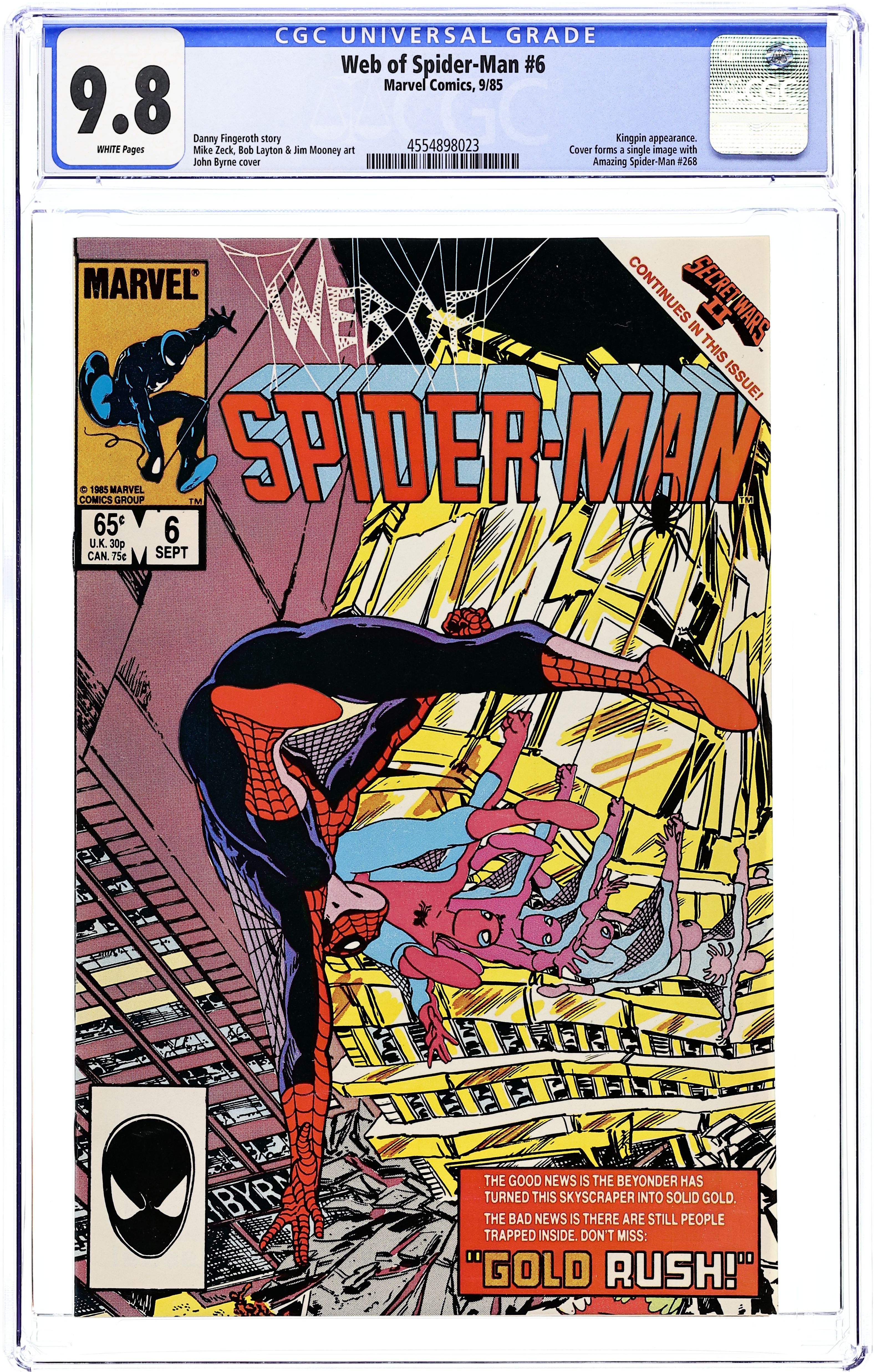 Direct Edition. "Gold Rush!" Secret Wars II crossover. Story by Danny Fingeroth. Art by Mike Harris, Bob Layton, Jim Mooney, Dave Simons, and Mike Zeck. Cover by John Byrne. The Beyonder has just turned Power Man and Iron Fist's office building into solid gold! Now the building has collapsed upon itself, and office workers are trapped inside! It's up to Spider-Man to rescue the wounded and perhaps grab a golden souvenir after he is finished. The story continues in Amazing Spiderman 268. Cameo appearances by the Kingpin and President Reagan. (Note: The cover of this issue can be paired with the cover of Amazing Spiderman 268 to form a complete image of the office building turned to gold.) 32 pages Cover price $0.65. Grade: CGC 9.8 explanation of grade Condition: Used (collectible)