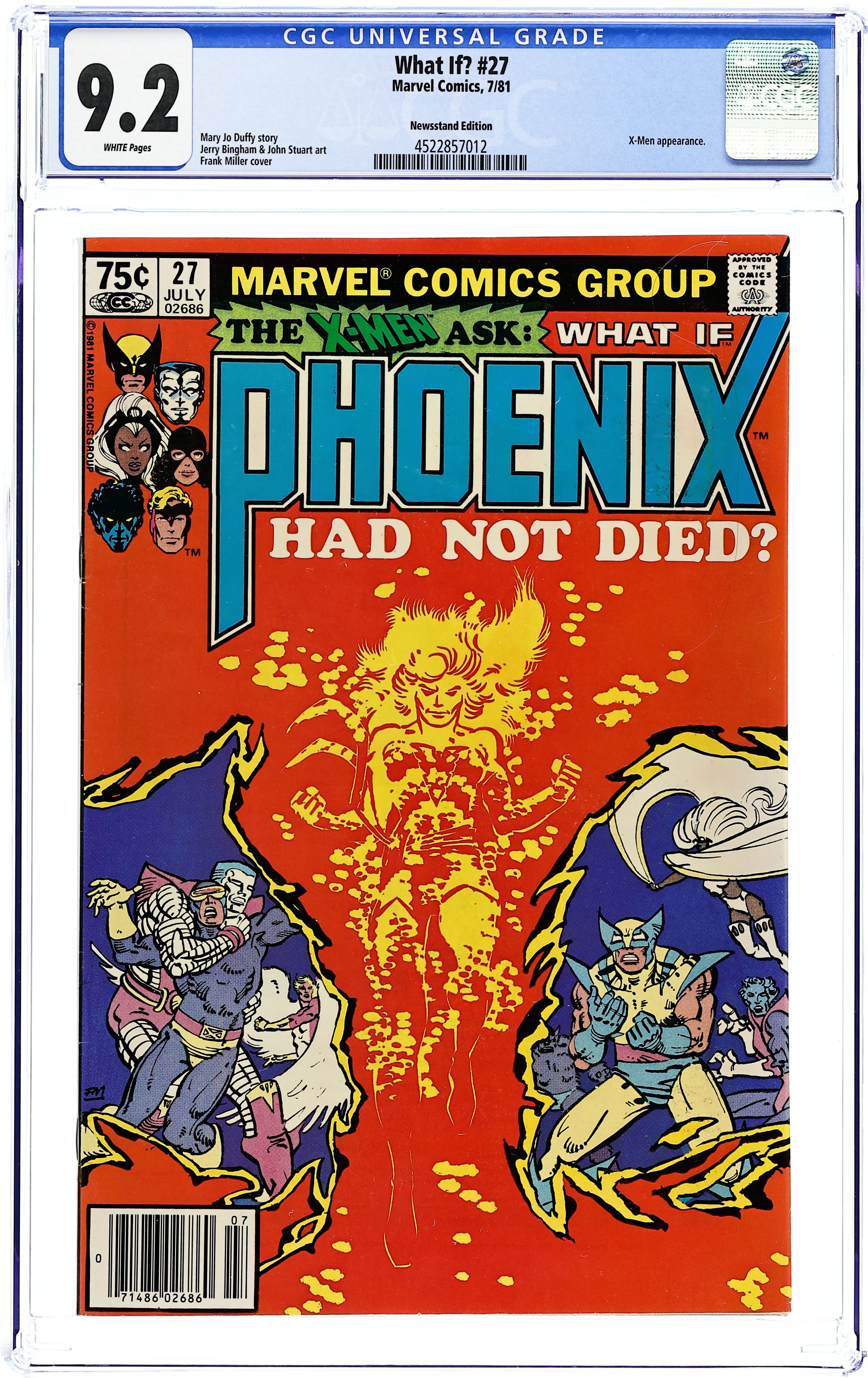 Newsstand Edition. Cover art by Frank Miller. "What If Phoenix Had Not Died?", script by Jo Duffy, pencils by Jerry Bingham, inks by John Stuart (pages 1-21), Al Milgrom (page 26), and Terry Austin (pages 31, 34); Uatu ponders over the story of the Jean Grey as the Phoenix and recalls her journey alongside the X-Men; He sees an alternate reality where she did not die during the incursion with the Shi'ar; In this alternate reality, she was reborn again and when the X-Men are called to battle Galactus and Terrax in the Shi'ar galaxy, she unleashes the Phoenix force. Based on The X-Men (1963 series) #137. "Kree Encounter!", script by Mark Gruenwald, pencils by Ron Wilson, inks by Bruce Patterson; Uatu recalls the story of Astron on the planet Uranus; He has found the Kree Sentry #213 destroyed; He goes to speak to his fellow exiled members and tells Uranos to stop the destruction of the Kree weapons; Uranos calls him a coward and says he is building a spaceship to travel back to Earth; Astron tells Uranos he is not leaving Uranus and he is left on the planet. "Spider-Man Vs. the Human Computer!" ad for Hostess Cup Cakes. 52 pgs. Cover price $0.75. Grade: CGC 9.2 explanation of grade Condition: Used (collectible)