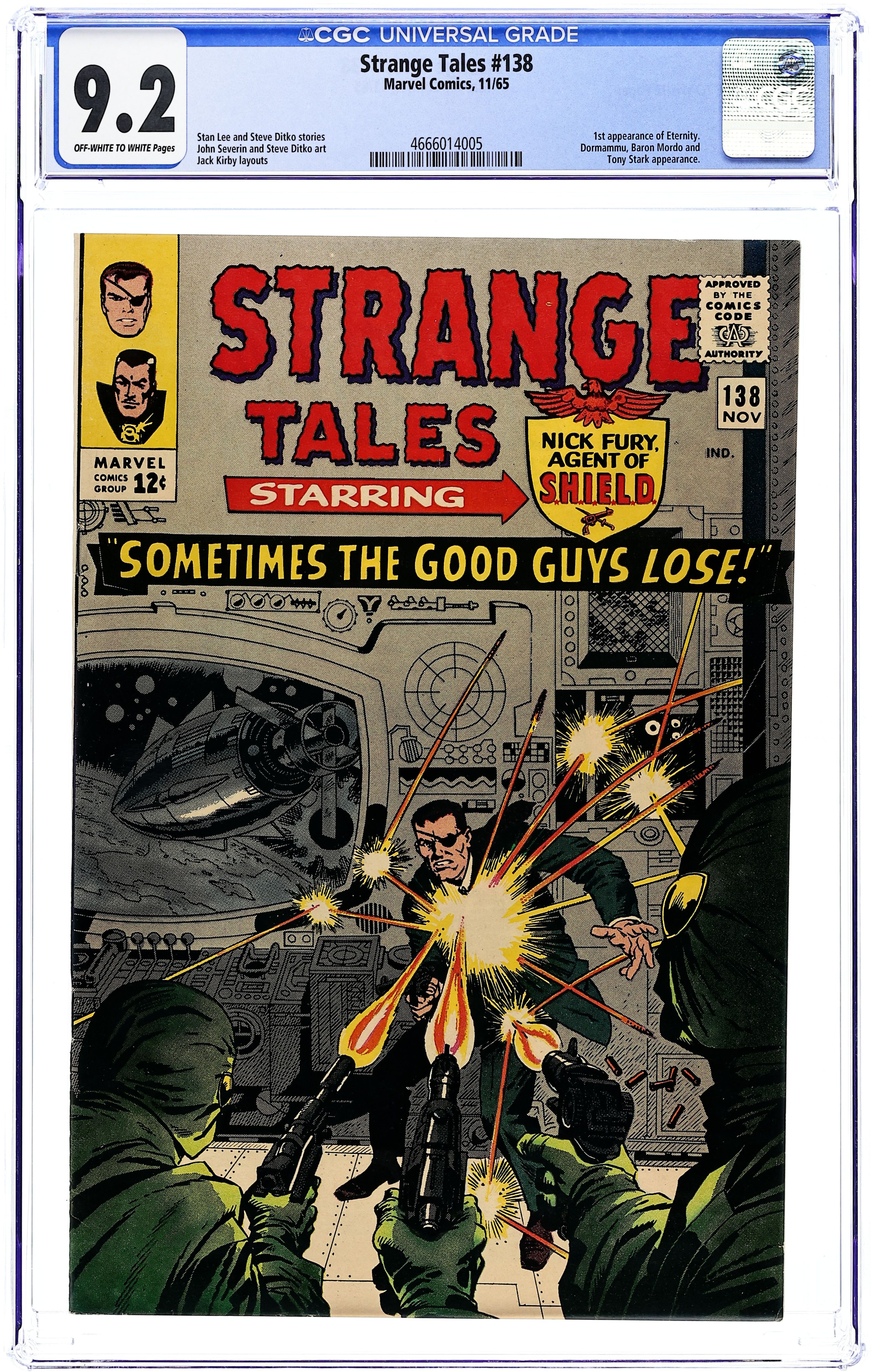 Starts Jan 3 Cover pencils by Jack Kirby, inks by John Severin. "Sometimes the Good Guys Lose!", script by Stan Lee and Jack Kirby (co-plot), pencils by Jack Kirby (layouts) and John Severin, inks by John Severin; Aboard SHIELD's Intercontinental Ballistic Plane Fury uses the Televiewer Tube to locate the Betraton Bomb launch site; It is destroyed but the bomb was already launched; Agent G unsuccessfully implores her father, Imperial Hydra to come to his senses; He sends HYDRA's Fox Division to deliver his terms to every nation on Earth; Tony Stark prepares to show Fury the Braino-Saur,a new weapon when HYDRA agents capture him. "If Eternity Should Fail!", script by Steve Ditko (plot) and Stan Lee (dialogue), art by Steve Ditko; In another dimension that defies description, Dr. Strange comes face-to-face with Eternity, who learns that Strange is indeed worthy of The Ancient One's trust; He knows that if Mordo & Dormammu are not stopped, all mankind will be in jeopardy; But after all Strange has been through, Eternity tells him he already has the power he needs; First appearance of Eternity; Appearance by Clea. 36 pgs., full color. Cover price $0.12. Grade: CGC 9.2 explanation of grade Condition: Used (collectible)