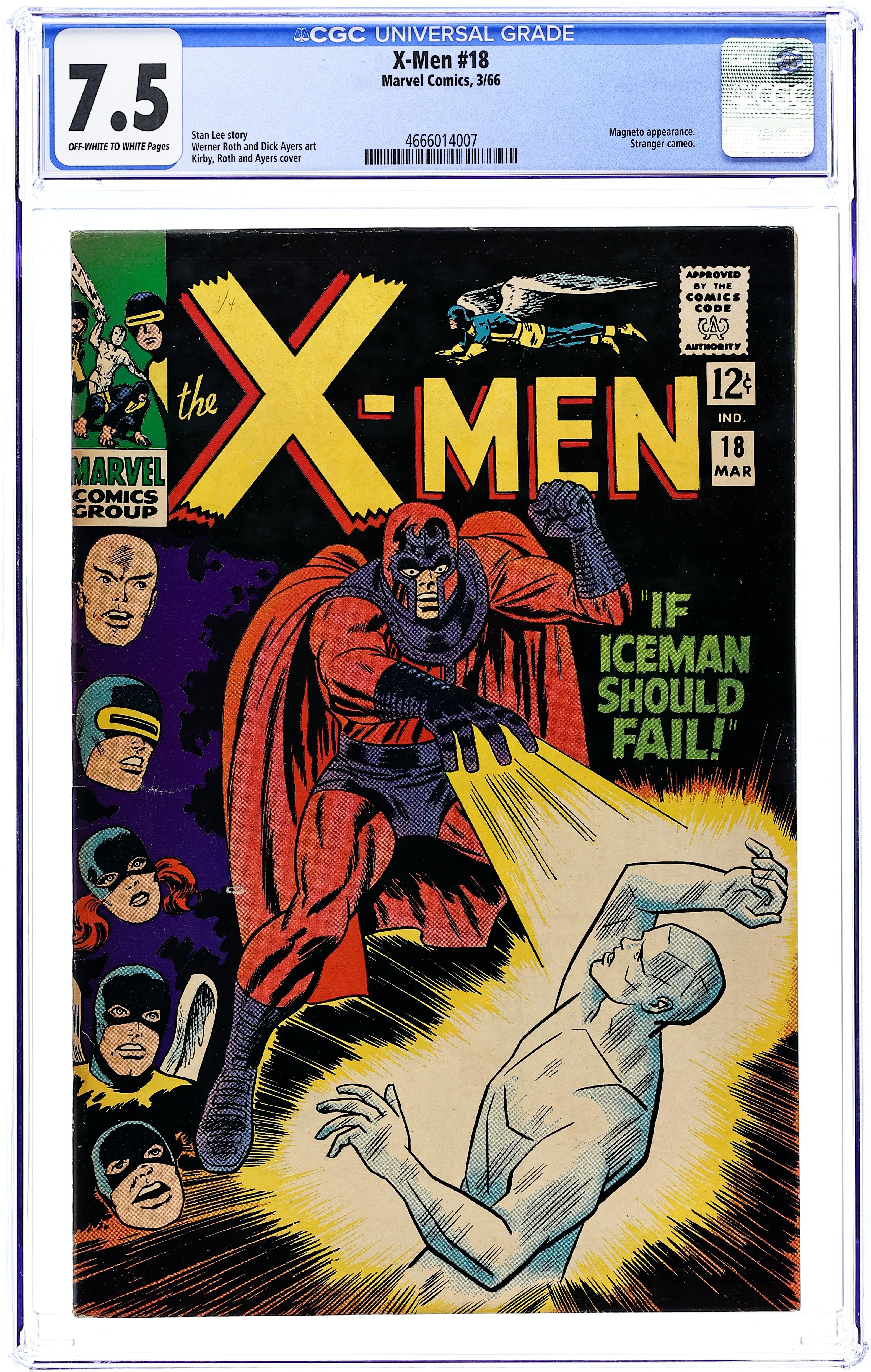 Starts Dec 15 If Iceman Should Fail--!, script by Stan Lee, pencils by Werner Roth [as Jay Gavin], inks by Dick Ayers; With the rest of the X-Men captured in a lead balloon, it is up to an injured Iceman to battle Magneto on his own; Once the X-Men escape Magento's trap, Professor X calls the Stranger who arrives on earth to collect his former captive. 36 pgs. $0.12. Cover price $0.12. Grade: CGC 7.5 explanation of grade Condition: Used (collectible)
