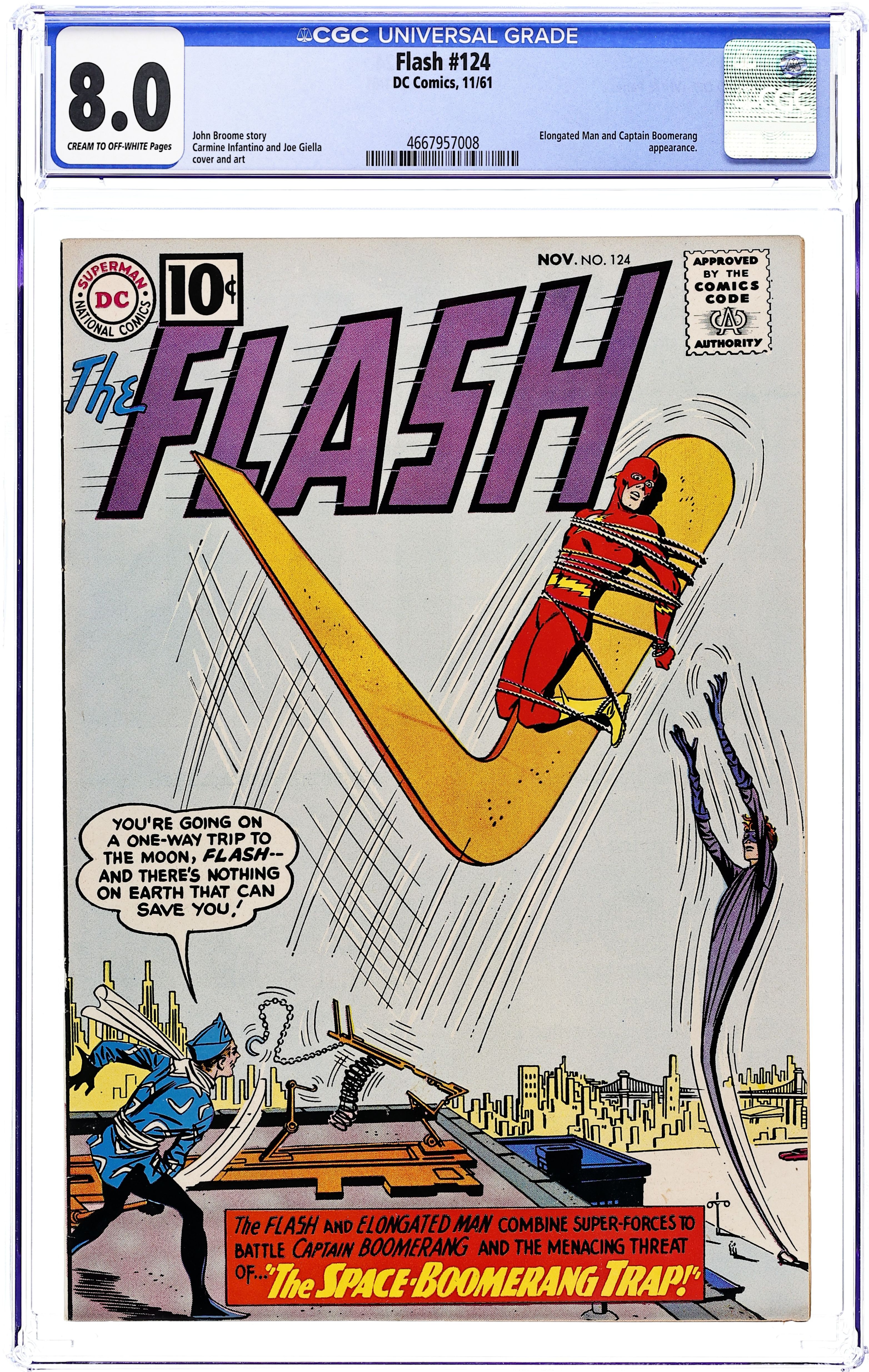 Starts Jan 3 Last 10-cent cover price. Cover pencils by Carmine Infantino, inks by Joe Giella. Space-Boomerang Trap!, script by John Broome, pencils by Carmine Infantino, inks by Joe Giella; Captain Boomerang is paroled from prison and invents a time-traveling boomerang; Flash and Elongated Man stop Boomerang; all three join together to battle aliens. Vengeance Via Television!, script by John Broome, pencils by Carmine Infantino, inks by Joe Giella; When James Lawton is released from jail he takes revenge on those who put him in jail by using his new psi-helmet. Sea Devils #1 ad. Letter from fanzine writers Bernie Bubnis and Robert Jennings. Letter from Infantino. Amazing Speeds fact page. 36 Pages, Full Color. Cover price $0.10. Grade: CGC 8.0 explanation of grade Condition: Used (collectible)