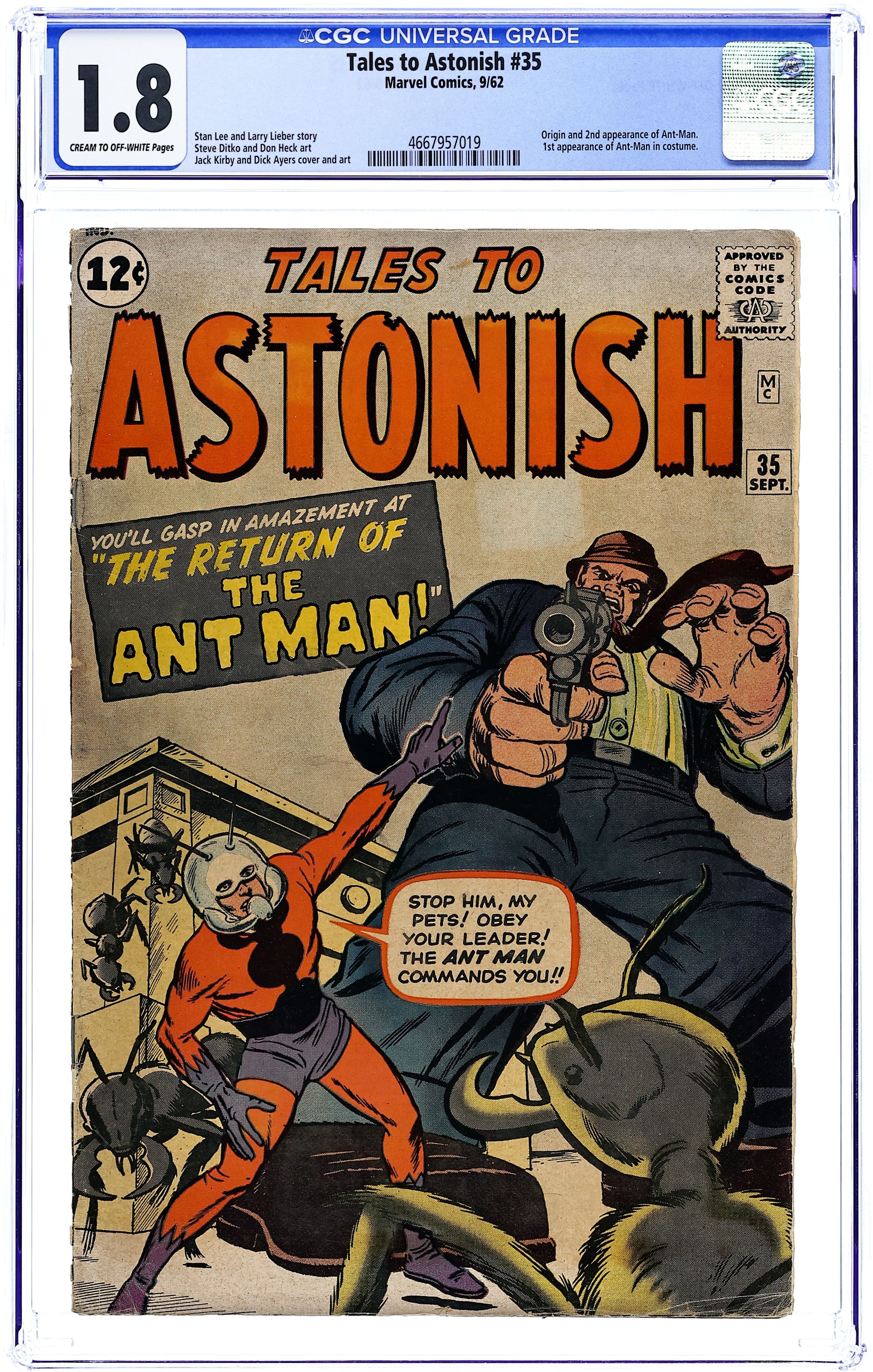 Starts Jan 3 Cover by Jack Kirby and Dick Ayers. Return of the Ant-Man, Part 1, script by Stan Lee and Larry Lieber, art by Jack Kirby and Dick Ayers; Henry Pym invents an anti-radiation gas, that attracts the attention of communist spies. Strange Encounter, art by Joe Maneely; An American tourist in Paris is unwittingly targeted by a spy as an intelligence courier and is nearly killed. Return of the Ant-Man Part 2: An Army of Ants, script by Stan Lee and Larry Lieber, art by Jack Kirby and Dick Ayers; Henry Pym learns how to command ants to do his bidding and frees his captured assistants, with the help of the ants. Return of the Ant-Man Part 3: The Ant-Man's Revenge!, script by Stan Lee and Larry Lieber, art by Jack Kirby and Dick Ayers; Henry Pym invents an anti-radiation gas, that attracts the attention of communist spies. The Doorway to Nowhere!, script by Stan Lee, art by Steve Ditko; After escaping from jail, Hugo Cragg heads for a deserted mansion to hide out until the heat is off. The Thing from Outer Space!, art by Don Heck. 36 pgs., full color. $0.12. Cover price $0.12. Grade: CGC 1.8 explanation of grade Condition: Used (collectible)