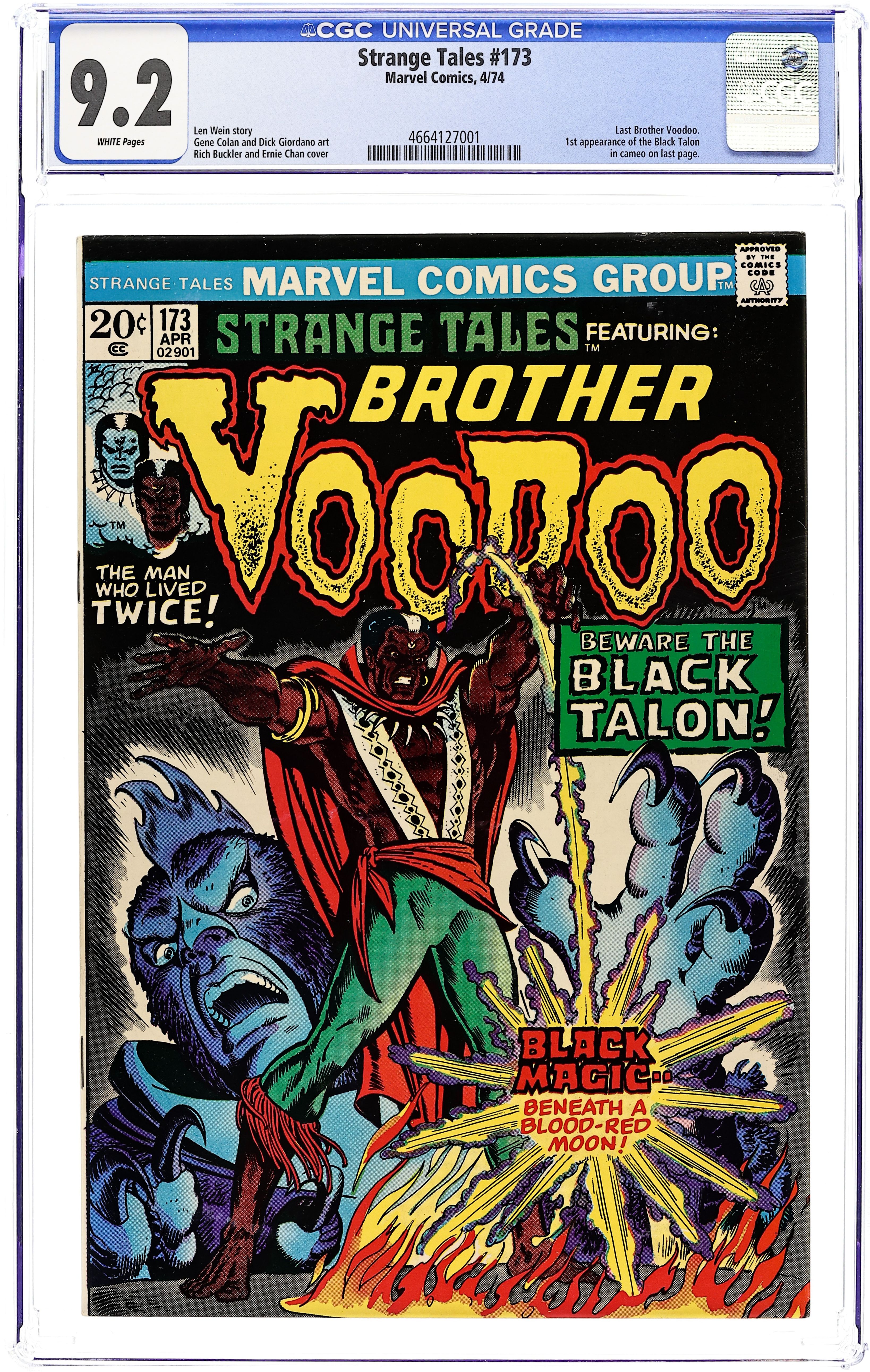 Starts Dec 15 Last 20-cent cover price. Cover inks by Ernie Chan. "Sacrifice Play," script by Len Wein, pencils by Gene Colan, inks by Dick Giordano; To aid in his mission to try and find Loralee Tate, Brother Voodoo pays a visit to an old woman named Mama Limbo who apparently has clairvoyant abilities; Her visions tell him to go and seek out Desmond Drew, who she believes has a connection to the Cult of the Darklord; As Brother Voodoo goes to check out this lead, at the police station Samuel Tate and Pete Hawkins debate on what to do about Samuel's missing daughter; They finally decide that Brother Voodoo would hamper their efforts to find her themselves and put out an APB to have him arrested on sight. "Bait," art by Manny Stallman; Scientists on board a fishing boat haul up a creature from the bottom which threatens to expand to colossal size, but the captain of the boat cuts it up before this can happen to use as chum for better fishing. Final appearance of Brother Voodoo in this title; the story continues in Tales of the Zombie 6. The letters page contains Marvel Value Stamp series A #45 (Mantis). Ad for Fantastic Four #145. 36 pgs., full color. Cover price $0.20. Grade: CGC 9.2 explanation of grade Condition: Used (collectible)