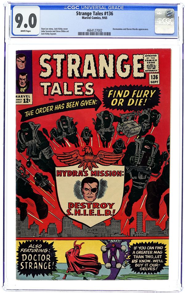 Starts Dec 15 Cover pencils by Jack Kirby and Steve Ditko (bottom tier), inks by Mike Esposito and Steve Ditko (bottom tier). "Find Fury or Die!", script by Stan Lee and Jack Kirby (co-plot), pencils by Jack Kirby (layouts) and John Severin, inks by John Severin; HYDRA agents tail Fury intent on finding SHIELD's HQ, but Fury is aware he's being followed. HYDRA Section Leader B, a "Hydra-Hunter," runs the mission and hands over his hood to the Imperial Hydra so he will have no place to hide should he fail; When a few HYDRA agents show up at the barber shop which is the secret entrance to SHIELD's HQ, they're captured and hypnotized into believing the HQ is located in a warehouse blocks away. "What Lurks Beneath the Mask?", script by Steve Ditko (plot) and Stan Lee (dialogue), art by Steve Ditko; Dormammu imprisons Clea, telling her she will witness Strange's defeat. Mordo tells Dormammu that Strange is searching for "Eternity" and is puzzled by the dark lord's violent reaction; Strange continues his search, going from one mystic to another with no results, until The Aged Genghis tells him only he and The Ancient One know the secret; He gives him a scroll, which leads Strange to a being imprisoned in another dimension; a trap he barely escapes. 36 pgs., full color. Cover price $0.12. Grade: CGC 9.0 explanation of grade Condition: Used (collectible)