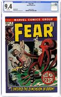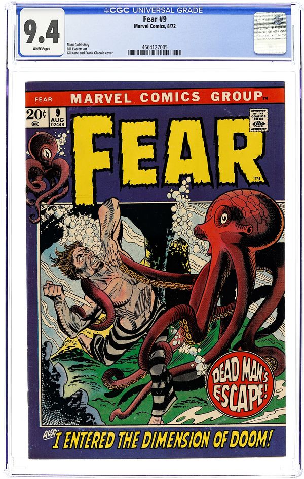 Starts Dec 15 All reprints: Cover pencils by Gil Kane, inks by Frank Giacoia. "I Entered the Dimension of Doom!", pencils by Jack Kirby, inks by Dick Ayers; A teenager uncovers a plot of two-dimensional beings to invade Earth by posing as a construction crew to dig a hole in the street that acts as a passageway between dimensions and thwarts their designs. "The Greatest Magician of All," script by Mimi Gold, art by Bill Everett; An old theater watchman tells the story of The Great Marko, a magician who searched for the greatest magic trick of all only to have it stolen by his rival. "Dead Man's Escape!", art by Joe Maneely; A convict from an island prison tries to escape by being dumped in the bay inside of a corpse bag; Instead of dumping him in the bay, a large well has been dug which they are now using to dispose of bodies, inhabited by a large octopus. 36 pgs., full color. Cover price $0.20. Grade: CGC 9.4 explanation of grade Condition: Used (collectible)