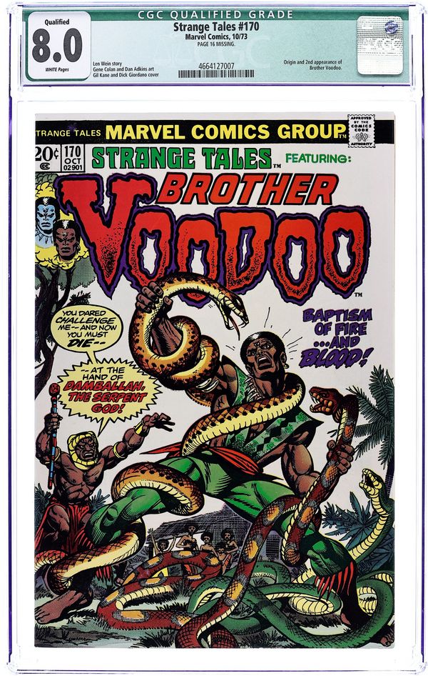 Starts Dec 15 Cover pencils by Gil Kane. "Baptism of Fire!", script by Len Wein, pencils by Gene Colan, inks by Dan Adkins; Papa Jambo trains Jericho Drumm to be Brother VooDoo; Brother VooDoo then returns and stops Damballah, the Serpent God. 36 pgs., full color. Cover price $0.20. Grade: CGC 8.0 explanation of grade Condition: Used (collectible)