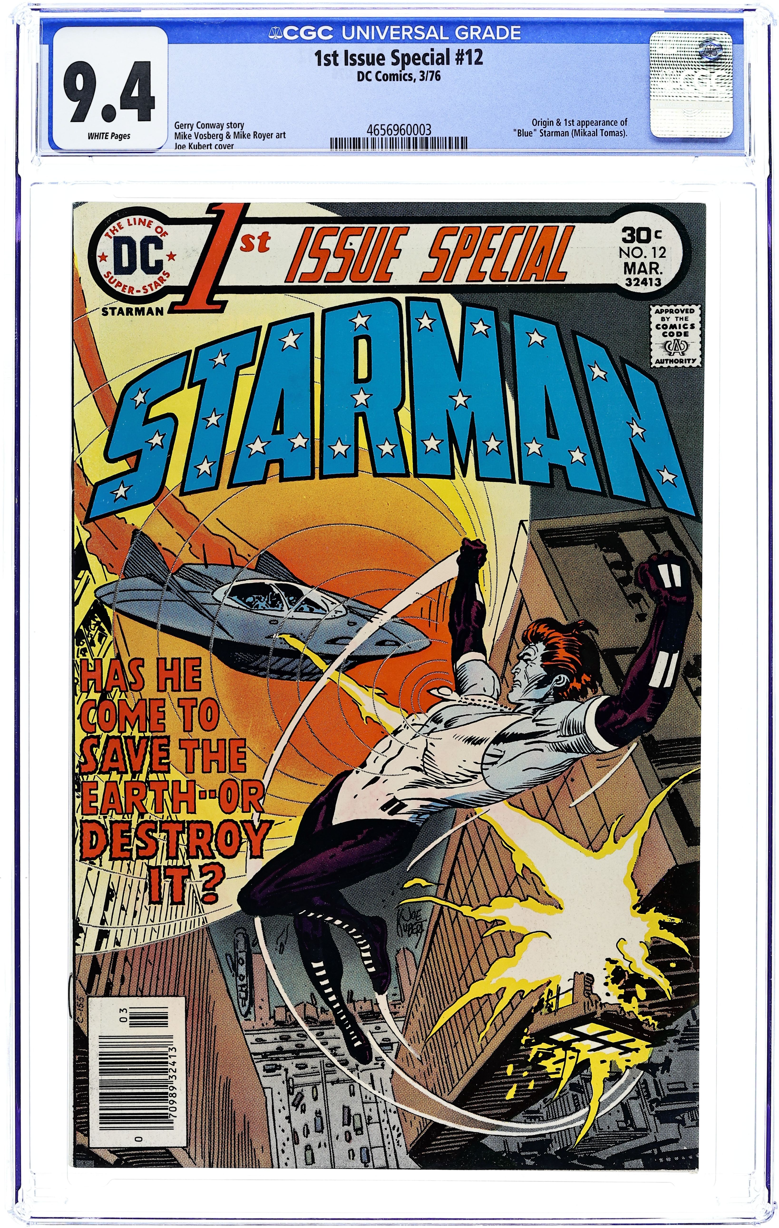 Starts Dec 15 "Starman" Pursued by Turran Kha, amiable alien Mikaal Tomas flees to Earth and warns of an impending invasion. Origin and first appearance of new Starman. Superman stars in a one-page public service announcement, "Justice For All Includes Children" (art by Neal Adams). Captain Marvel stars in a one-page Hostess ad, "The Cup Cake Caper." Script by Gerry Conway, pencils by Mike Vosburg, inks by Mike Royer, cover by Joe Kubert. Cover price $0.30. Grade: CGC 9.4 explanation of grade Condition: Used (collectible)