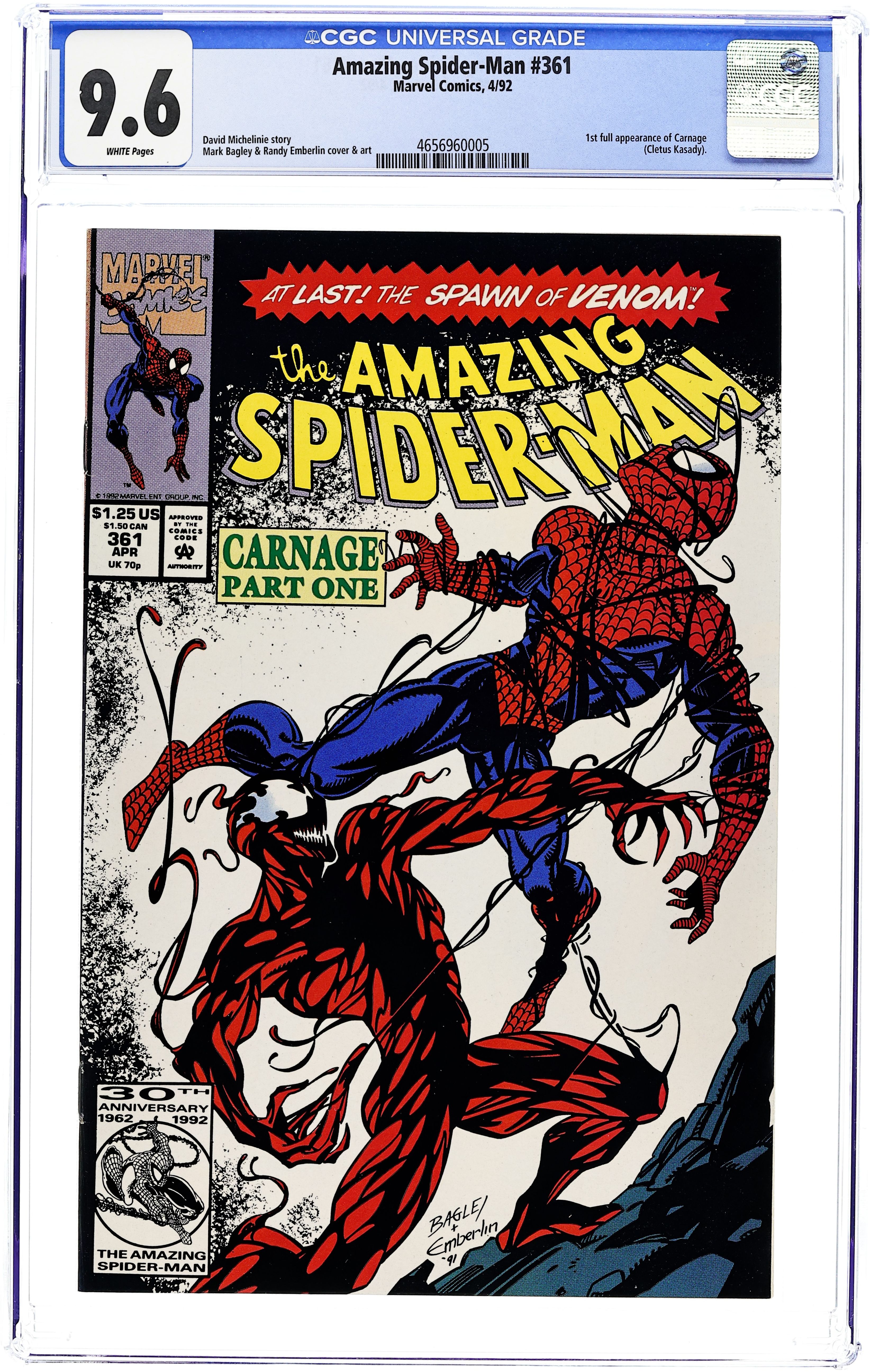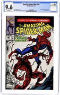Starts Dec 15 First Printing. Direct Edition. First (full) appearance of Carnage in "Savage Genesis!" Part 1 of 3. Script by David Michelinie. Pencils by Mark Bagley. Inks by Randy Emberlin. Cover by Mark Bagley and Randy Emberlin. Blood runs in the streets as a serial killer roams New York City! And as the web-slinger investigates the murders, he notices a very disturbing similarity to another killer's modus operandi! In a burned-out building in Brooklyn, the spectacular one comes face-to-face with his new homicidal foe...Carnage! Can the wall-crawler end Cletus Kasady's rampage in their very first encounter? Cameo appearances by Aunt May and Mary Jane Watson. Flashback cameo by Venom. (Note: This three-part story was reprinted in 2011 in the trade paperback: Spider-Man -- The Vengeance of Venom.) 36 pages, full color. $1.25 cover price. NOTE: Most of these were distributed with slight printer tears in the bottom edge of the cover. Cover price $1.25. Grade: CGC 9.6 explanation of grade Condition: Used (collectible)