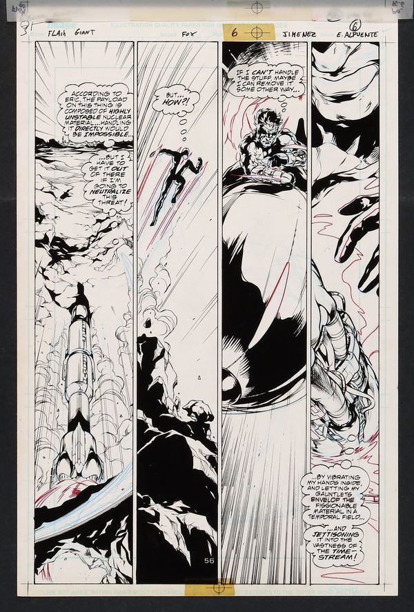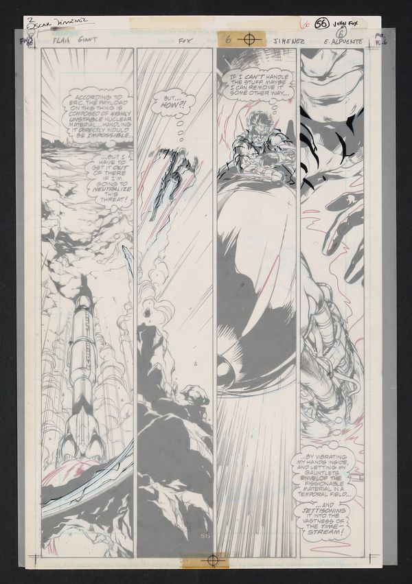 - The time-hopping Flash of the Future John Fox finds himself in a time period where nuclear war is imminent- so imminent that within minutes he finds himself on top of a just-launched warhead on this thrilling page! Signed by Jimenez in top right margin. Pencil and ink on Image Comics art board with vellum overlay for additional effects attached at the top with tape. Board measures 11" x 17", overlay is slightly wider.