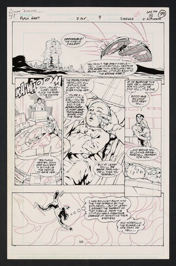 - John Fox, the time-displaced Flash of the Future, has averted nuclear armageddon for the world of 2945 but the war still marches on! As Fox is thrust back into the timestream, the kindly couple who helped him get his bearings prepare to save their daughter in a very familiar way! Signed by Jimenez in top right margin. Pencil, ink, and screentone on Image Comics art board. 11" x 17".
