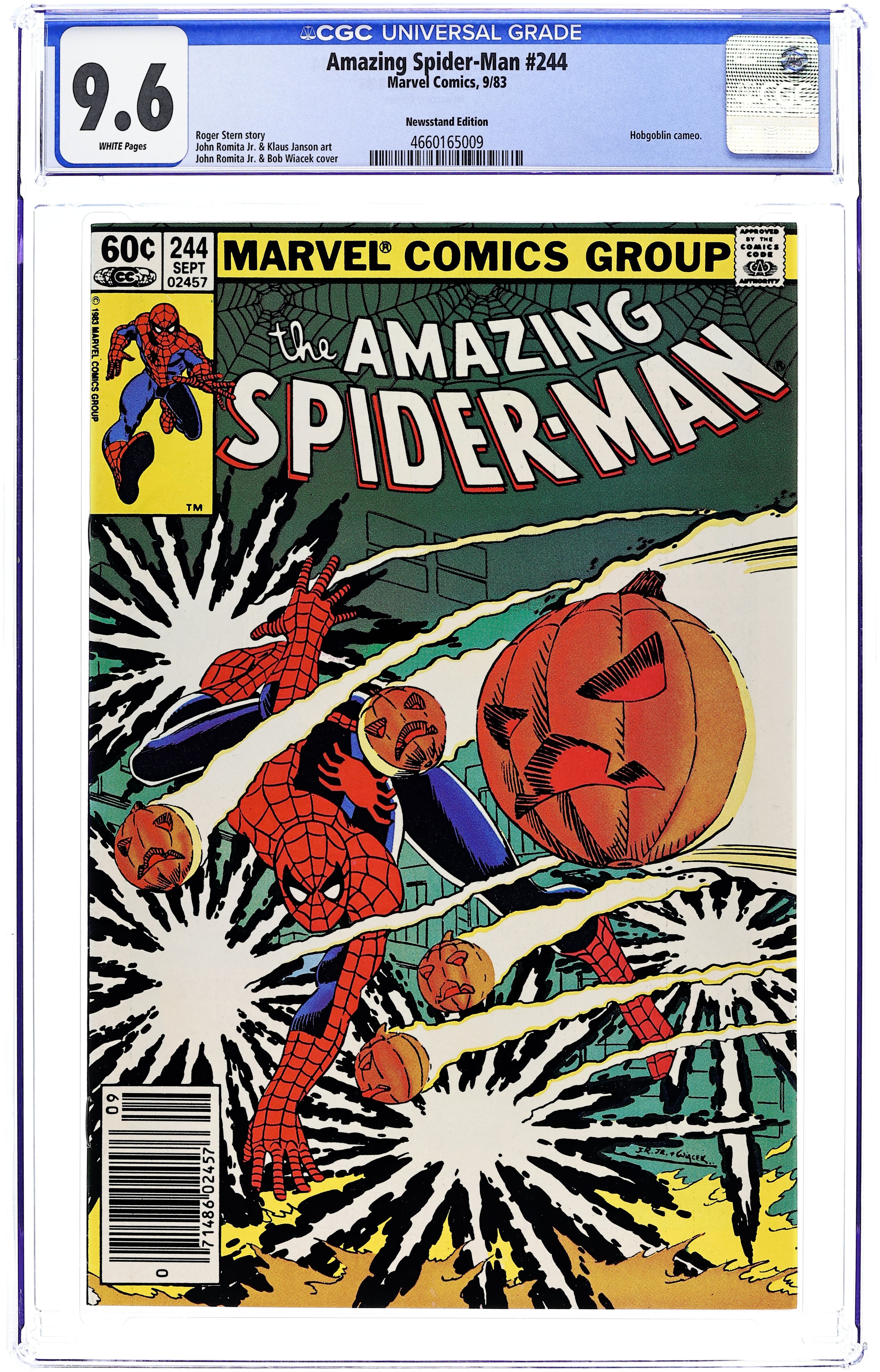 Newsstand Edition. "Ordeals!" Part 1 of 2. Third appearance of the Hobgoblin. Script by Roger Stern. Art by John Romita Jr. (breakdowns) and Klaus Janson (finishes). Cover by John Romita Jr. and Bob Wiacek. Last issue Peter Parker made the very tough decision to drop out of graduate school. At this point Aunt May doesn't know that he did. When she finds out...she won't be happy. Meanwhile the burglaries at the Osborn facilities continue! Fortunately, on the eastside docks the web-slinger catches one in progress! Can Spider-Man corral the Hobgoblin this time? Cameo appearances by the Black Cat, Mary Jane Watson, Harry & Liz Osborn, and Dr. Morris Sloan. (Note: This two-part story was reprinted in the 1992 trade paperback: The Origin of the Hobgoblin; and the 2011 trade paperback also titled: The Origin of the Hobgoblin.) 36 pgs. Cover price $0.60. Grade: CGC 9.6 explanation of grade Condition: Used (collectible)