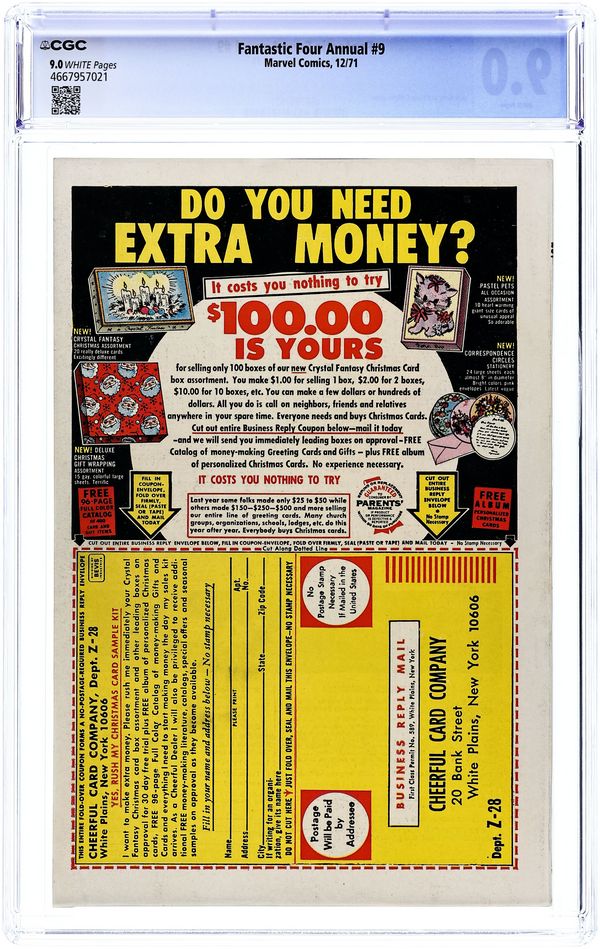 Starts Dec 15 All Jack Kirby reprints: "Lo, There Shall Be an Ending" (from FF 43, minus page 10), "The Bouncing Ball of Doom" (Strange Tales 131), "Bedlam of the Baxter Building" (FF Annual 3, minus pages 7 and 8). The cover reprints that of FF 43. 68 pgs. Cover price $0.25. Grade: CGC 9.0 explanation of grade Condition: Used (collectible)