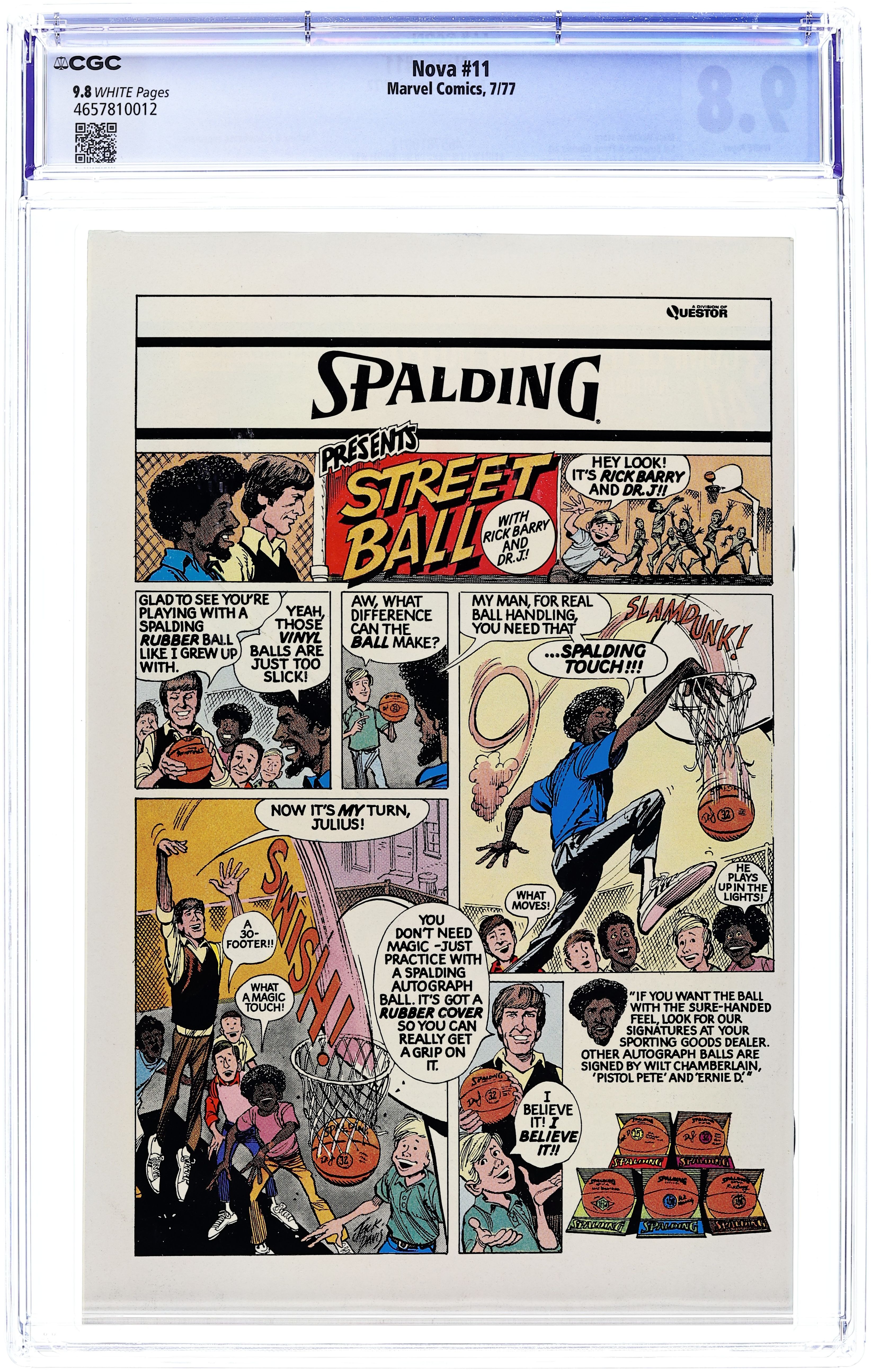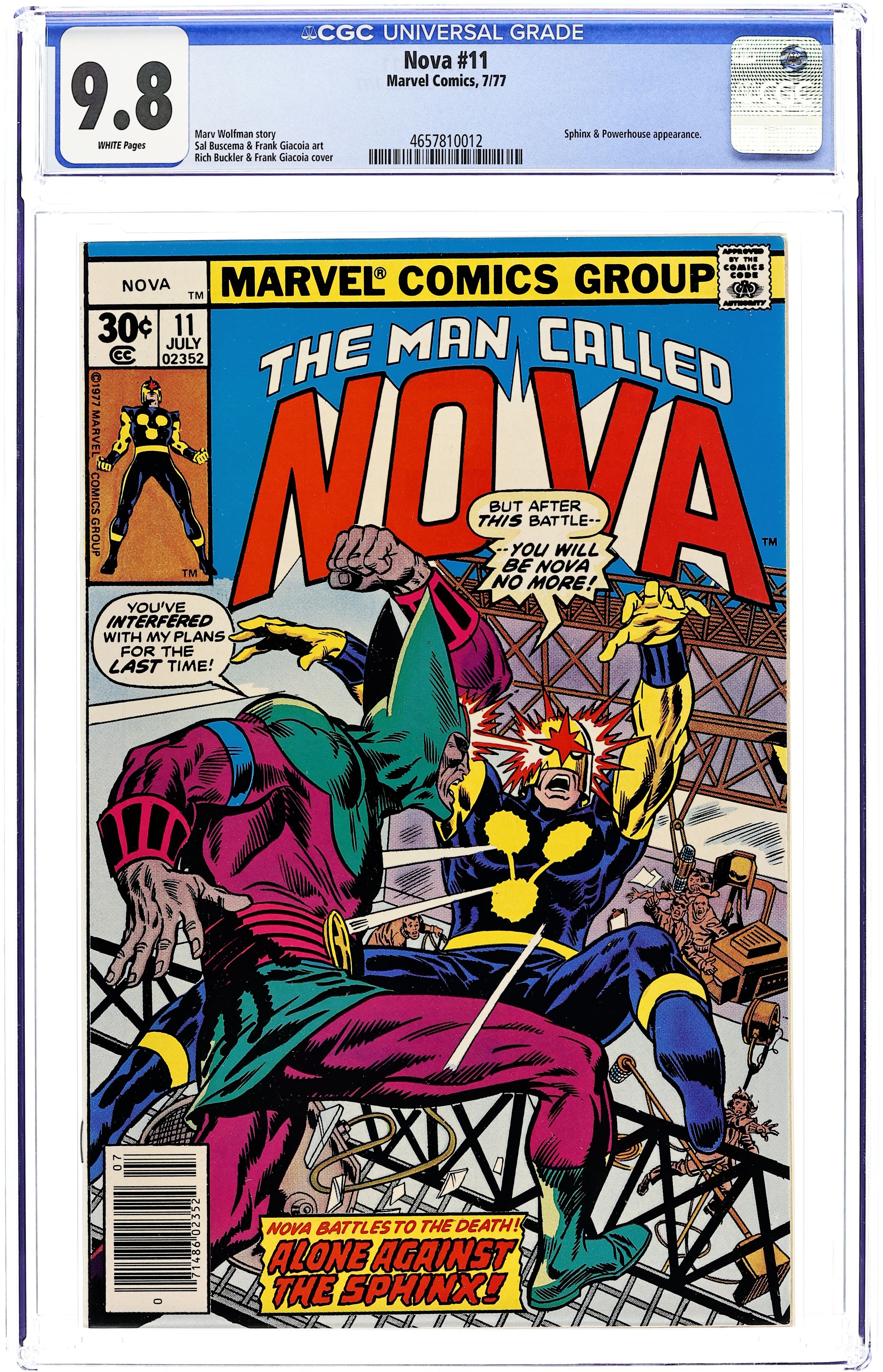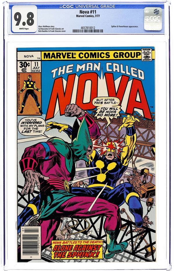 Starts Jan 3 Story by Marv Wolfman. Art by Sal Buscema and Frank Giacoia. The ultra powerful Sphinx has crushed Diamondhead, Powerhouse, and the Condor. Now, Nova stands alone against this ancient and nigh unstoppable power. And if he loses, Richard Rider shall be "Nova No More!" 32 pages. Cover price $0.30. Grade: CGC 9.8 explanation of grade Condition: Used (collectible)