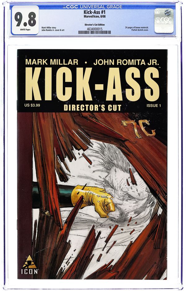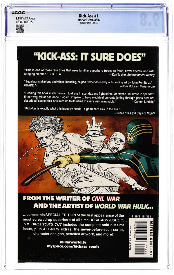 Director's Cut. Written by MARK MILLAR Pencils and Cover by JOHN ROMITA JR. The biggest super hero debut of 2008 gets the Director's Cut treatment! The writer of CIVIL WAR and the artist of WORLD WAR HULK bring you the secret origin of Dave Lizewski: he wasn't the class jock, or the class geek...but he was a comic book fan. And one day, he put on a super hero costume-and got his ass kicked. The complete sold-out first issue is reprinted here, along with ALL-NEW extras: the never-before-seen script, character designs, penciled artwork, and a host of other amazing features! 48 PGS./Mature ...$3.99 Cover price $2.99. Grade: CGC 9.8 explanation of grade Condition: Used (collectible)