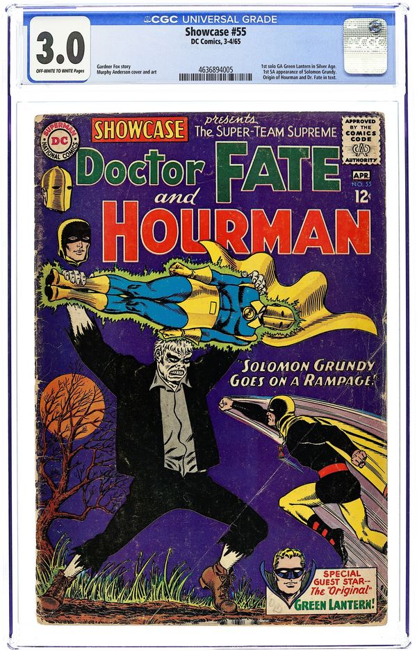 Starts Dec 15 Cover by Murphy Anderson. 1st solo Golden Age Green Lantern in Silver Age (pre-dates Green Lantern 40), Doctor Fate, and Hourman star in "Solomon Grundy Goes on a Rampage!", script by Gardner Fox, art by Murphy Anderson; When Solomon Grundy last fought Green Lantern Alan Scott, Green Lantern encased Solomon Grundy in an emerald sphere prison floating above Earth; Years later, the sphere has now crash landed back on Earth, and Solomon Grundy has emerged to get his revenge on Green Lantern; Solomon Grundy instinctually heads back to his home of Slaughter Swamp, which at this point is bordering the Tyler Chemical Company plant; At the Tower of Fate, Kent Nelson is warned that there is trouble by his crystal ball; Seeing the source of the trouble to be Slaughter Swamp, Nelson becomes Dr. Fate; Hourman comes across Solomon Grundy in Slaughter Swamp; Hourman pops his Miraclo pill, then attacks Solomon Grundy. One-page text feature tells the origins of Dr. Fate and Hourman. 36 Pages, Full Color. Cover price $0.12. Grade: CGC 3.0 explanation of grade Condition: Used (collectible)