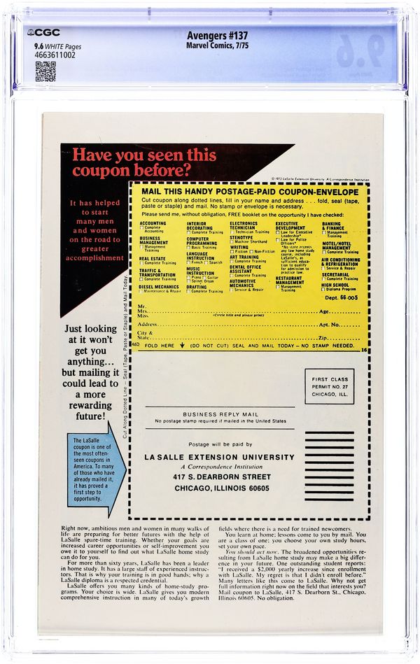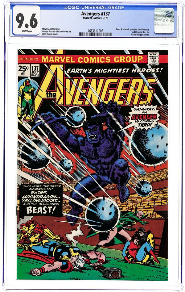 "We Do Seek Out New Avengers!" Part 1 of 2. Script by Steve Englehart. Pencils by George Tuska. Inks by Vince Colletta. Cover by John Romita. The epic celestial madonna saga has concluded in Giant-Size Avengers 4. And now Earth's Mightiest Heroes need to replenish their ranks! Moondragon, the Wasp, and Yellowjacket quickly sign up, but the Avengers still need one more member, so Iron Man and Thor hold tryouts at Shea Stadium. Who will answer the call to join? The bombastic Beast! However, someone else shows up at Shea Stadium too...the powerful Stranger! Will Hank McCoy survive his tryout? Meanwhile, the Vision and the Scarlet Witch enjoy their honeymoon in French Polynesia; and Hawkeye leaves the Avengers to go back in time to find the Black Knight. Cameo appearances by Agatha Harkness, the Black Panther, Black Widow, Captain America, Hercules, and Quicksilver. 36 pgs. Cover price $0.25. Grade: CGC 9.6 explanation of grade Condition: Used (collectible)