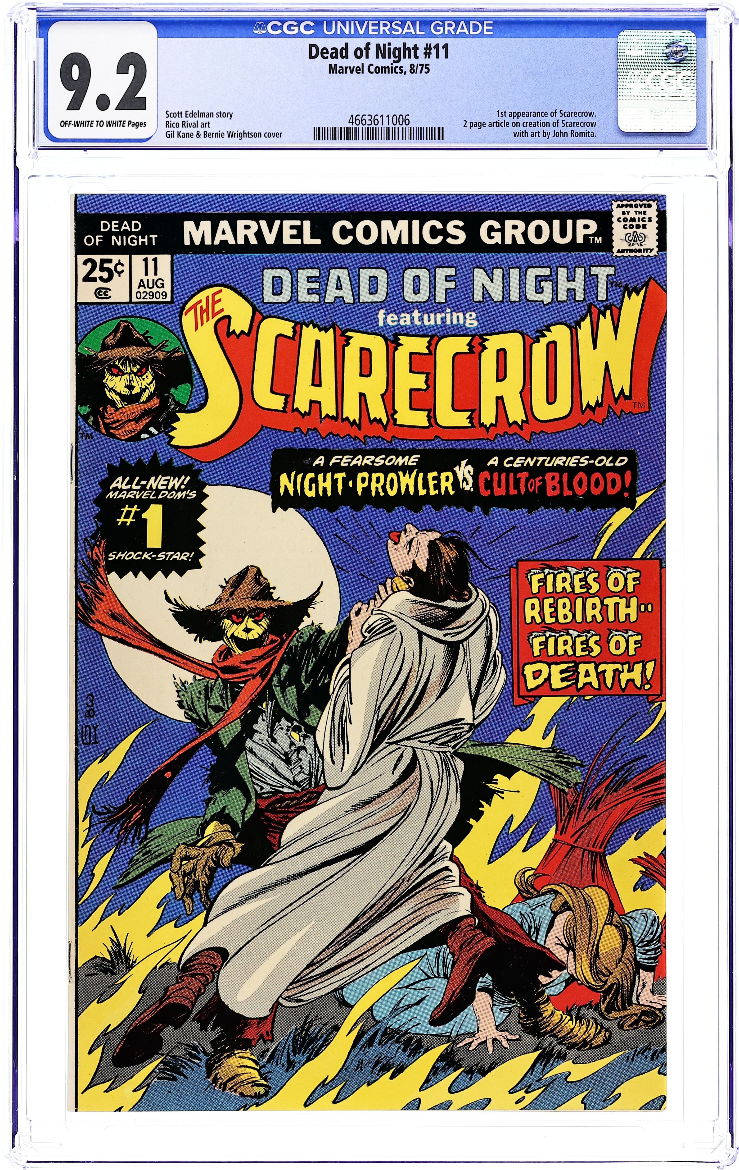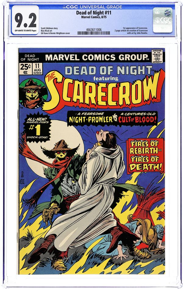 Cover pencils by Gil Kane, inks by Bernie Wrightson. Enter: The Scarecrow, script by Scott Edelman, art by Rico Rival; A scarecrow with supernatural powers apparently emerges from a painting to battle an evil cult. House ad for Marvel Treasury Edition #5, pencils by John Romita. Ad for the GI Joe Adventure Team toys from Hasbro. Hostess Twinkies ad with Captain Marvel, pencils by Ross Andru, inks by Mike Esposito. Scott Edelman discusses the genesis of the Scarecrow character, pencils by John Romita. 32 pgs.$0.25. Cover price $0.25. Grade: CGC 9.2 explanation of grade Condition: Used (collectible)