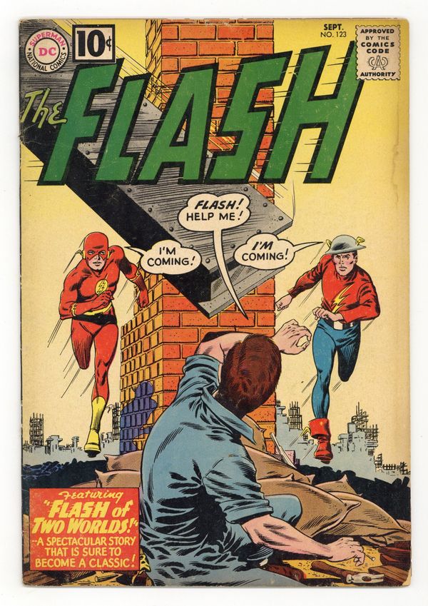 Starts Jan 3 Cover pencils by Carmine Infantino, inks by Murphy Anderson. 1st Silver Age appearance of Golden Age Flash; 1st mention of an Earth-2 where Golden Age heroes live. Flash of Two Worlds!, script by Gardner F. Fox, pencils by Carmine Infantino, inks by Joe Giella; Barry Allen appears at the Community Center in Central City to perform for kids, and during one of his amazing tricks, is mysteriously transported to Keystone City, a place that he recalls that the original Flash once lived; The two meet and Barry surmises that Jay lives on a parallel Earth, one that evidently Earth-1 writer Gardner Fox tuned in on when he wrote the adventures of the Flash in the 1940's; Jay tells Barry that a crime wave has hit Keystone City and asks Barry for his help. Fastest Trips Around The World! fact page. Promo for Superman Annual #3 and Secret Origins #1. Promo for Batman Annual #1, pencils by Curt Swan, Sheldon Moldoff, and Dick Sprang, inks by Charles Paris. Palisades Amusement Park ad with Superman. 36 Pages, Full Color. Cover price $0.10. Grade: GD+ 2.5 explanation of grade Condition: Used (collectible)