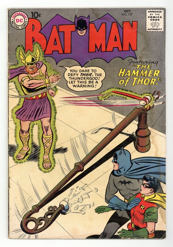 Cover pencils by Curt Swan, inks by Stan Kaye. "Batman's Super-Partner," script by Jerry Coleman, pencils by Dick Sprang, inks by Charles Paris; Accidently gaining super powers from a machine in the Bat-Cave, Alfred wants to use his powers to aid the Dynamic Duo, but he only hinders, not helps, them against the Joker. It's Fun to Learn! public service announcement, script by Jack Schiff, art by Bernard Baily. One-page Jail Jests story by Henry Boltinoff. "The Second Life of Batman," script by Bill Finger, pencils by Dick Sprang, inks by Charles Paris; Professor Nichols has created an alternate history machine and Bruce uses the device to see what would have happened if his parents had not have been killed. One-page Casey the Cop story by Henry Boltinoff. "The Hammer of Thor," script by Bill Finger, art by Sheldon Moldoff; When a hammer in a museum is struck by a meteorite, the charge affects the hammer and its force transforms a museum curator into Thor, God of Thunder, who begins to commit crimes. 36 Pages, Full Color. Cover price $0.10. Grade: GD 2.0 explanation of grade Condition: Used (collectible)