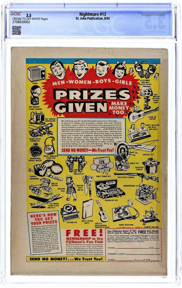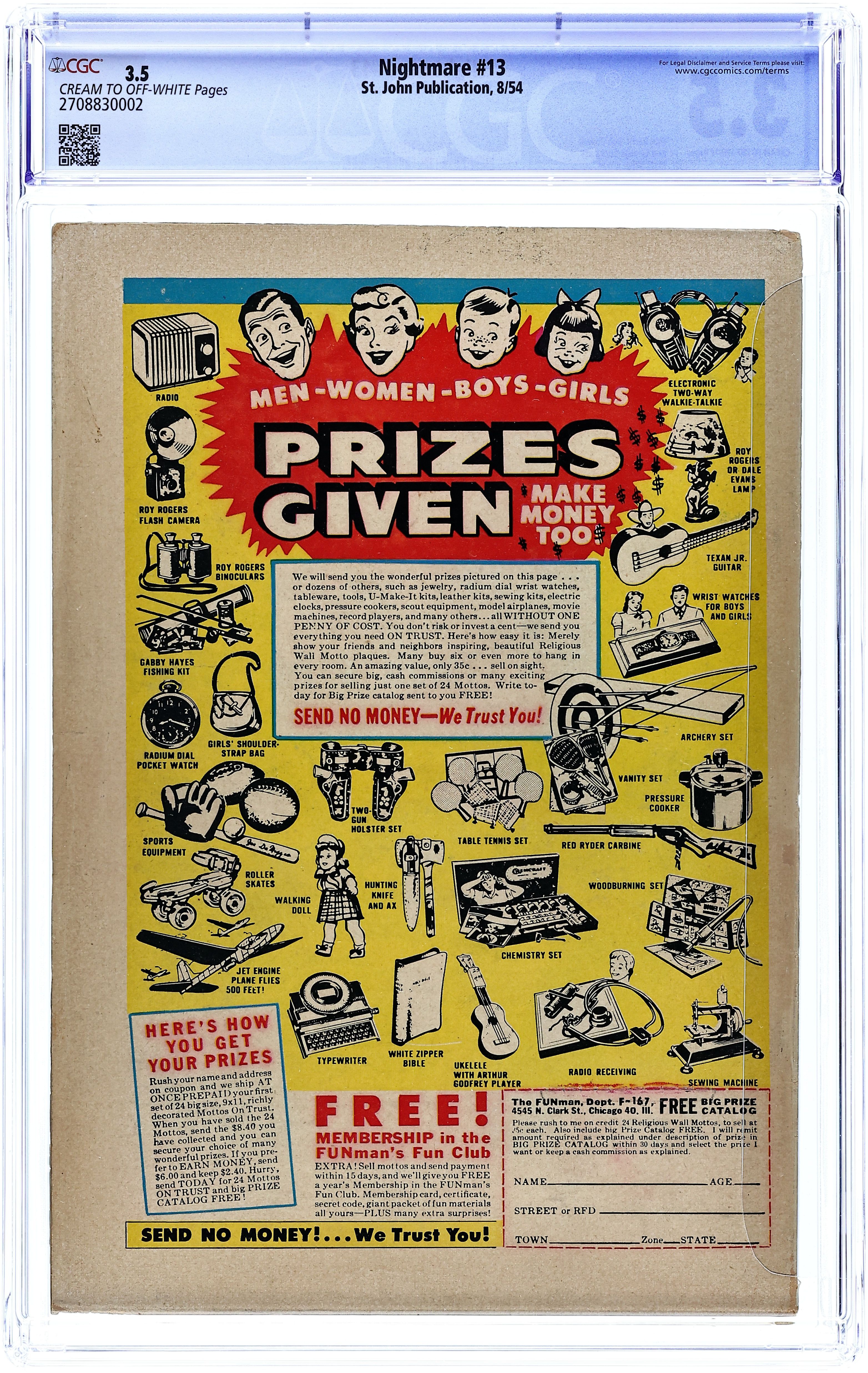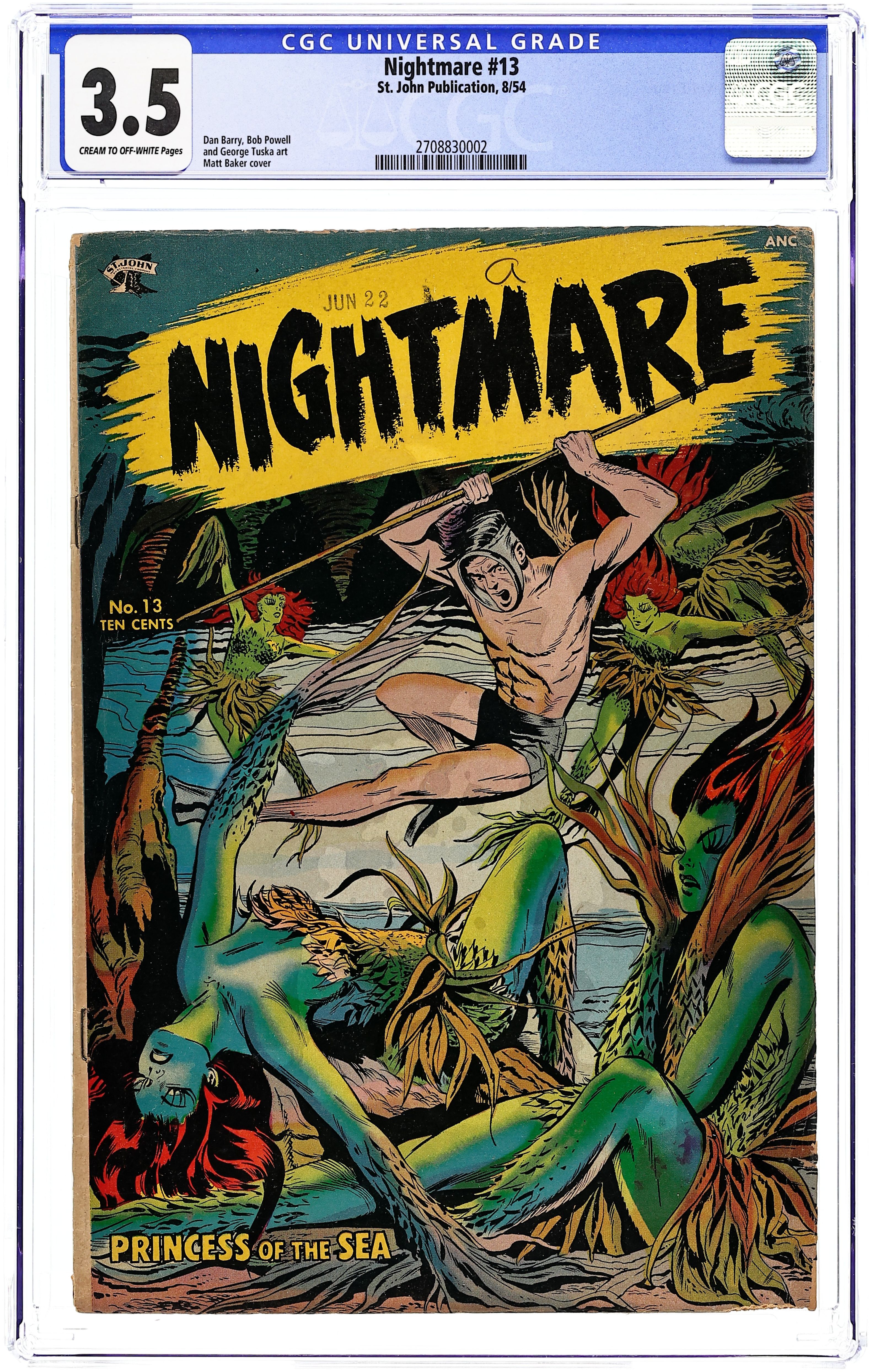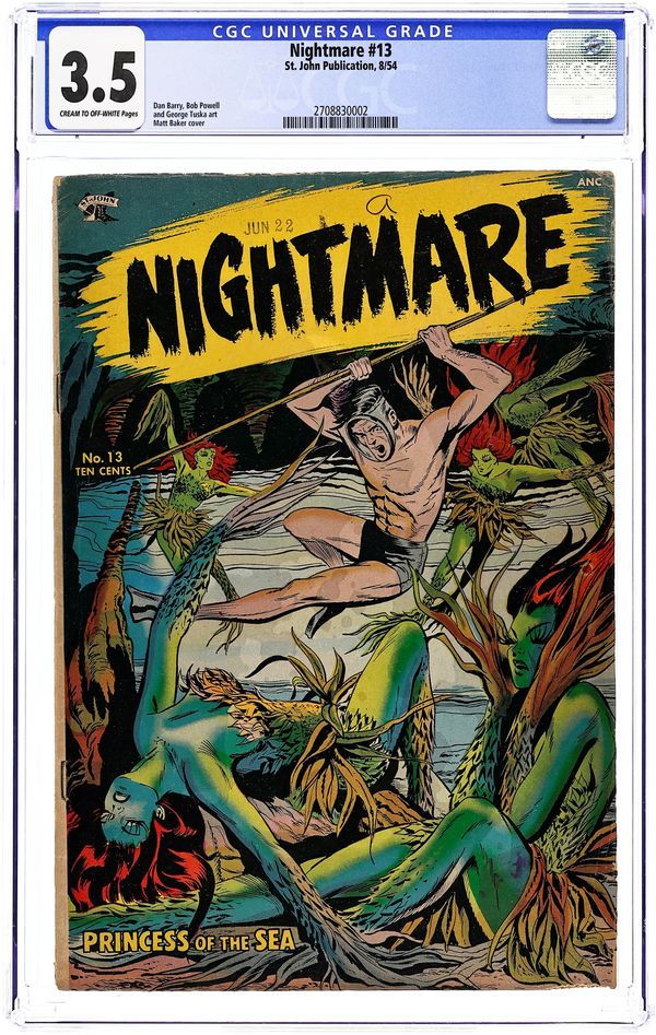 Cover by Matt Baker. Stories and art by Dan Barry, Bob Powell, and George Tuska. Classic pre-Code horror from St. John. John falls in love with Tania, a mermaid, after she saves him from drowning, in a story with early art by future Flash Gordon artist Dan Barry. Ben's soul seeks a new body to inhabit, in one of two stories this issue with art by comics legend Bob Powell. Bull, meanwhile, finds his soul split into two bodies, in a story with early art by comics legend George Tuska. Awesome mermaid cover by good-girl art legend Matt Baker. Princess of the Sea; The Soul of Benjamin Sprague; The Mind Reader; Death x 2 = 0; The Shadow on the Screen; Space Age Glass. Final issue under this title; series continues as Amazing Ghost Stories (1954 St. John) #14. 32 pages, Full Color. Cover price $0.10. Grade: CGC 3.5 explanation of grade Condition: Used (collectible)