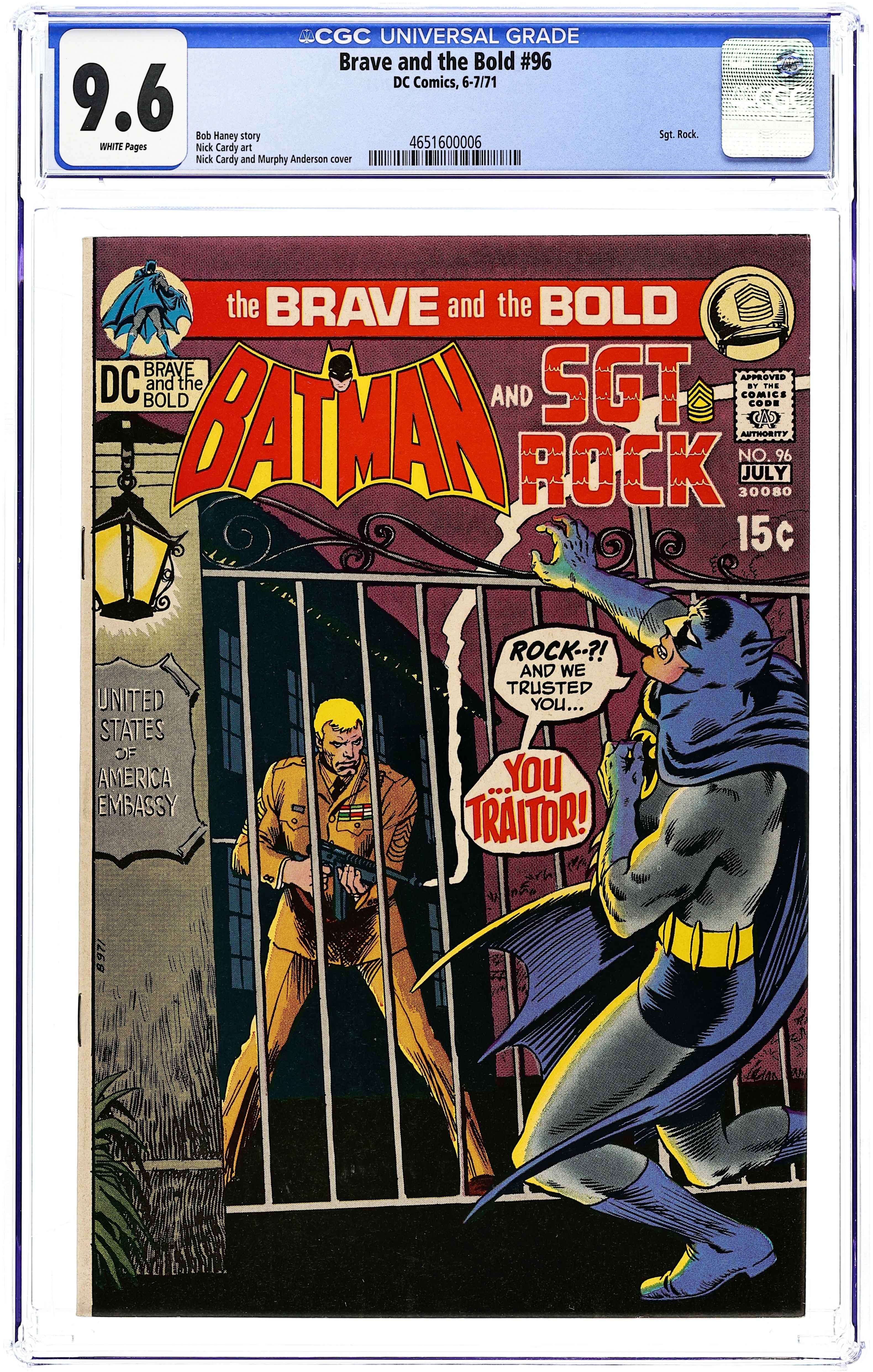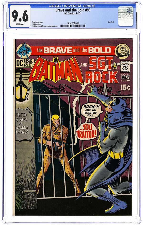 Last 15-cent issue. Cover pencils by Nick Cardy and Carmine Infantino (Batman figure), inks by Nick Cardy and Murphy Anderson (Batman figure). "The Striped Pants War!", script by Bob Haney, art by Nick Cardy; When friend of Bruce Wayne, Ambassador Adams is murdered by the Companeros De La Muerte, a terrorist outfit, Bruce Wayne is asked to go to the country of the Companeros' origin as temporary ambassador and sign a treaty before a given deadline, the President and the Secretary of State have asked Batman to act as Wayne's bodyguard (Batman making an appearance at the meeting thanks to Alfred in disguise); Flying to the country, Bruce is surprised to see that Sgt. Rock has been stationed as the embassy's chief of security; Rock is upset that after 30 years of service that he's been delegated to embassy duty and being given a hard time after botching protecting the ambassador; Believing there is a traitor in their midst, Batman begins to suspect Rock as the one working with the Companeros. 36 Pages, Full Color. Cover price $0.15. Grade: CGC 9.6 explanation of grade Condition: Used (collectible)