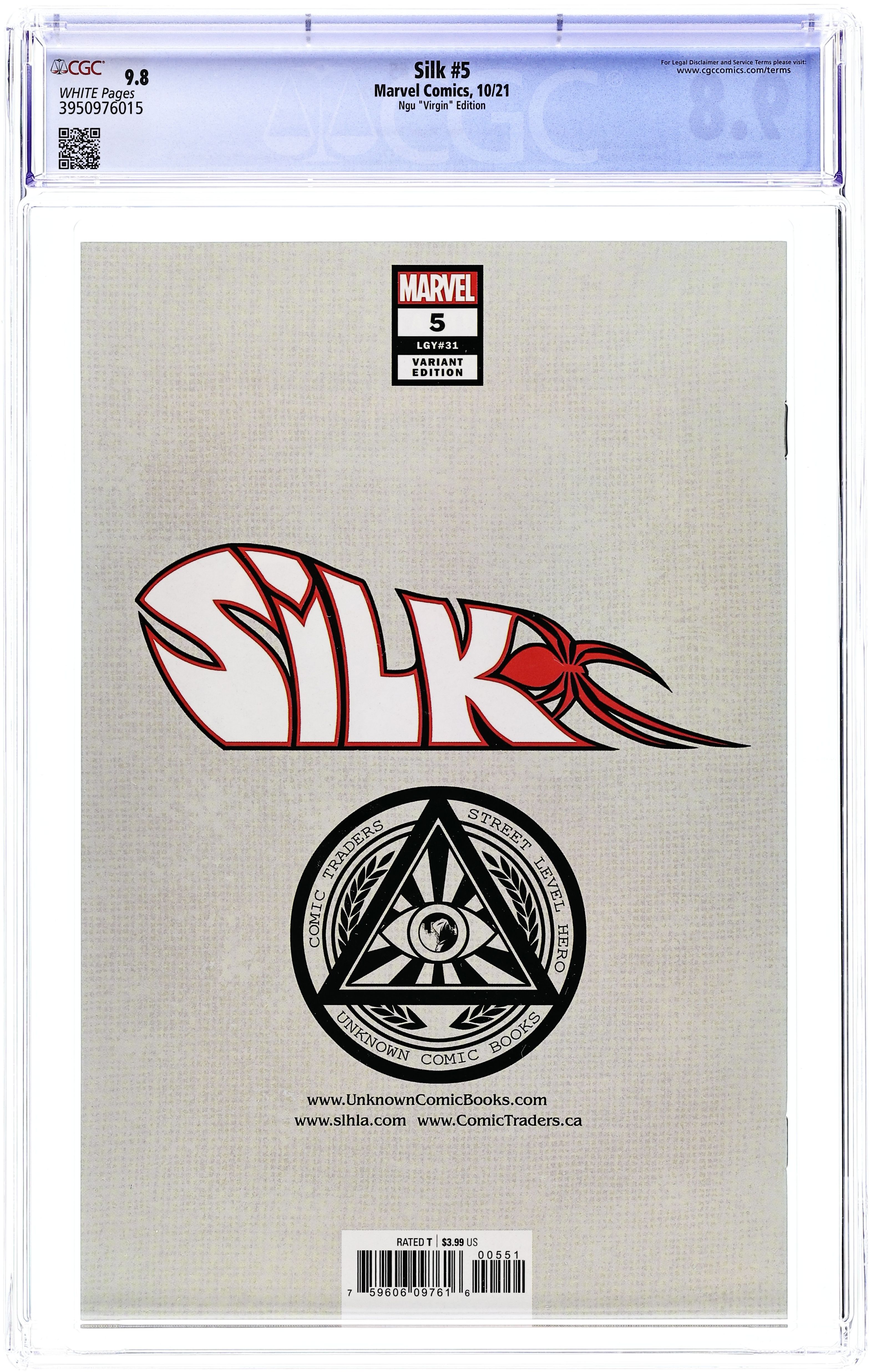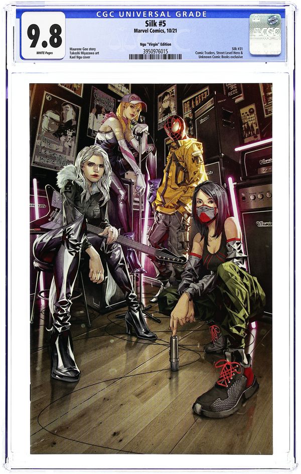 Comics Illuminati (Unknown Comic Books, Comic Traders, and Street Level Hero) Exclusive Virgin Cover by Kael Ngu. Written by Maurene Goo. Art by Takeshi Miyazawa. ENTER THE DEMON! It all comes down to this!!! Silk has one chance to stop Kasha from unleashing an ancient demon god! She'll have to join forces with an unlikely ally to do it. And some shocking revelations turn Silk's world upside-down! 28 pages, full color. Rated T Grade: CGC 9.8 explanation of grade Condition: Used (collectible)