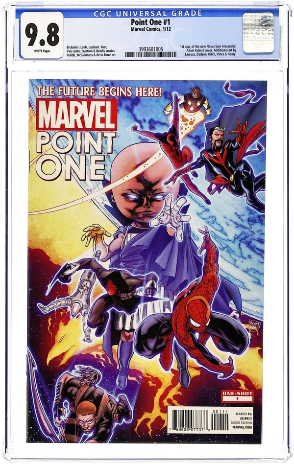 1st appearance of Nova (Sam Alexander) - Written and Drawn by BRIAN MICHAEL BENDIS, JEPH LOEB, ED BRUBAKER, MATT FRACTION, DAVID LAPHAM, FRED VAN LENTE, CHRISTOPHER YOST, ED mCGUINNESS, BRYAN HITCH, TERRY DODSON, ROBERTO DE LA TORRE, RYAN STEGMAN, JAVIER PULIDO, and MORE! IT ALL BEGINS HERE! Here are SEVEN all-new stories that set the stage for everything coming your way in 2012 from the biggest names in the comics industry. You CANNOT miss this! Catch a tease of the biggest change to the Marvel Universe in over 35 years! 64 PGS./Rated T+ ...$5.99 Cover price $2.99. Grade: CGC 9.8 explanation of grade Condition: Used (collectible)