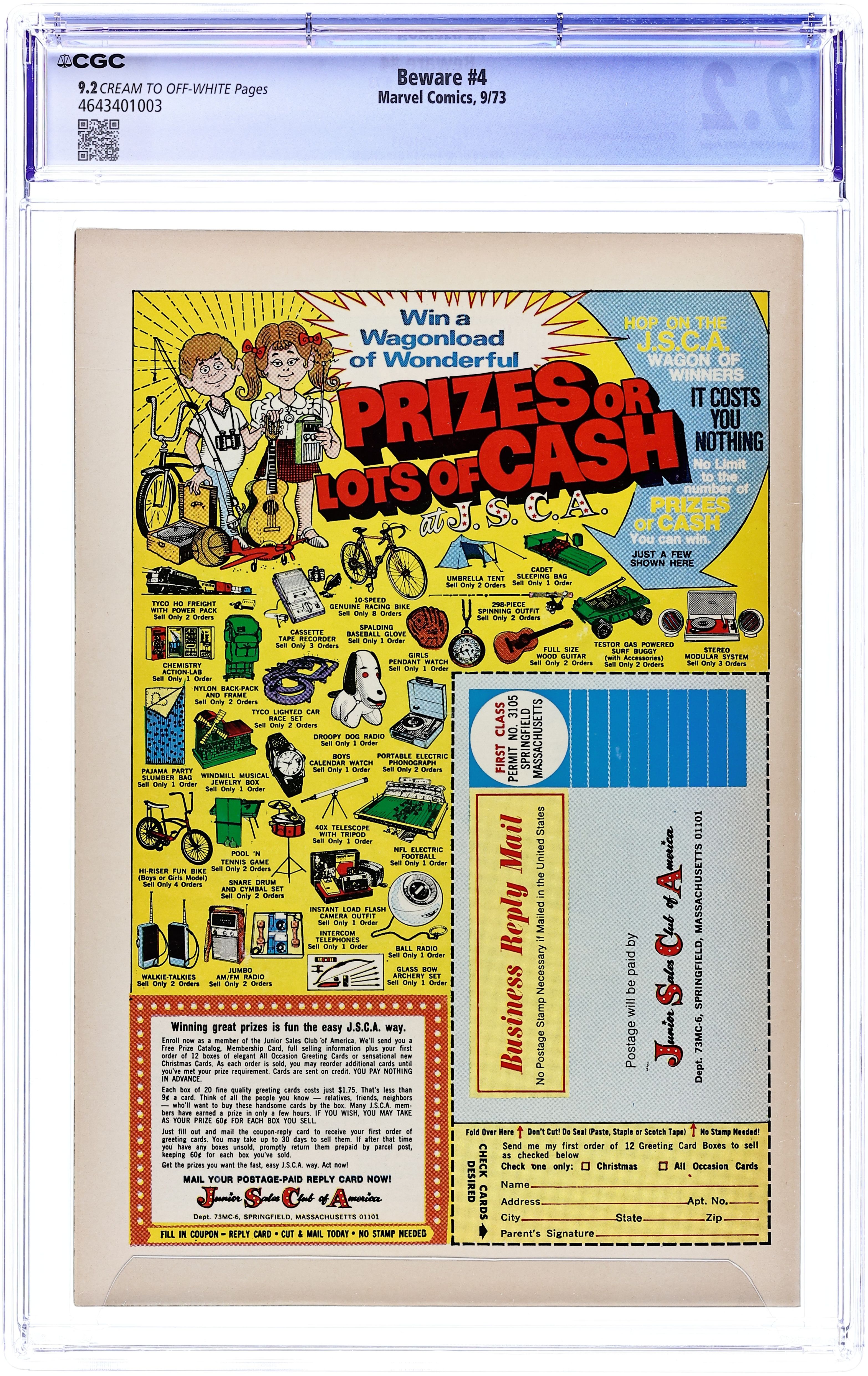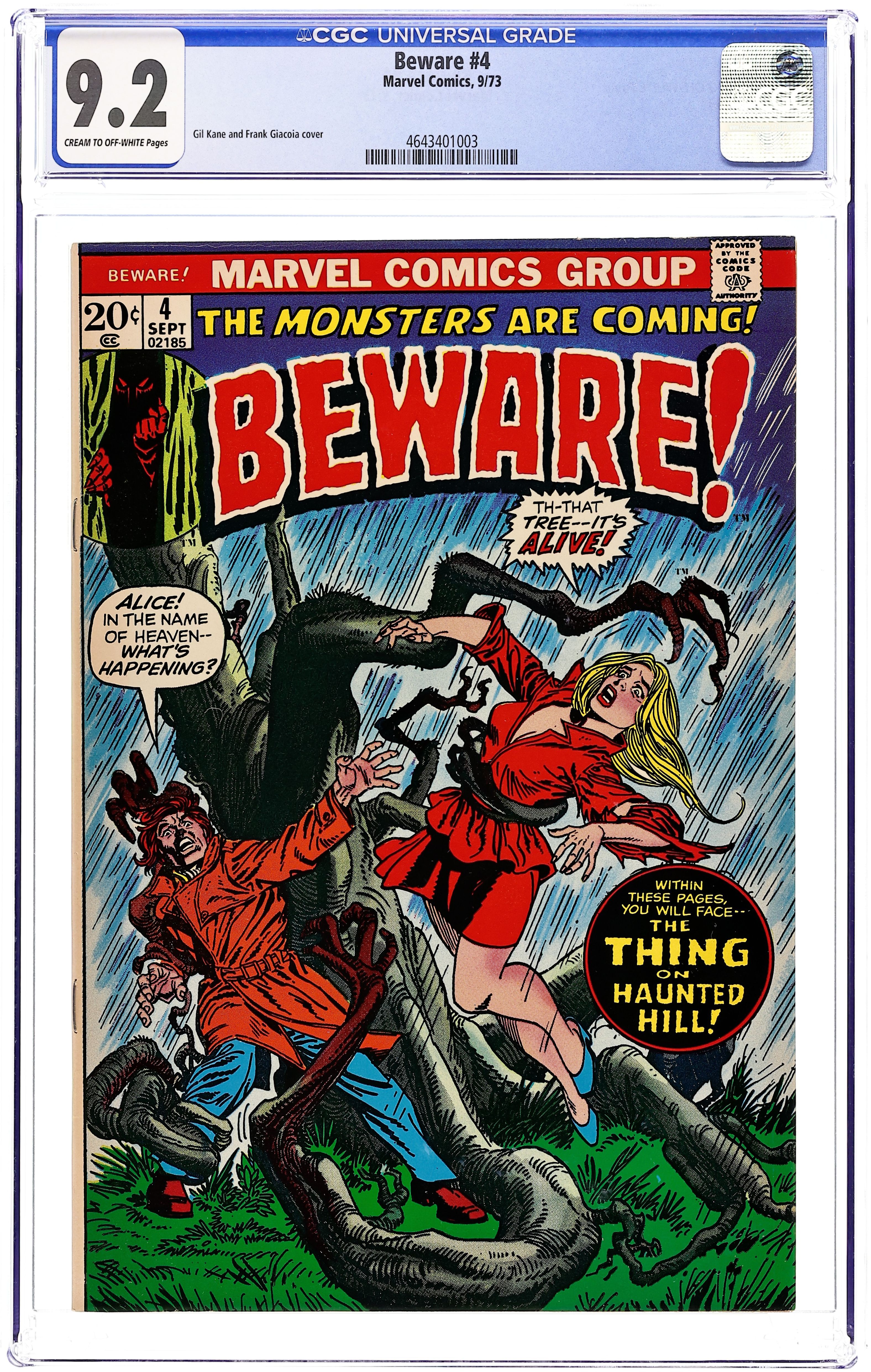 "Horror on Haunted Hill!" with script by Stan Lee, art by Carmine Infantino; "Forever Is a Long Time!"; "A Shriek in the Night" with script by Lee; and "The Man Who Walked on Water!" with art by Jay Scott Pike. Cover by Gil Kane. Stories by Stan Lee, Carmine Infantino, Larry Woromay, Stan Lee, Bill Savage, and Jay Scott Pike. Beware of these fear-filled suspense stories fill with action, intrigue and, best of all, monsters! All reprints from Adventures Into Weird Worlds. Ad for Savage Tales #2, art by Barry Windsor-Smith. Ad for Foom! (Friends of Ol Marvel). Ad for Conan the Barbarian King Size Special. 36 pages, full color. $0.20. Cover price $0.20. Grade: CGC 9.2 explanation of grade Condition: Used (collectible)