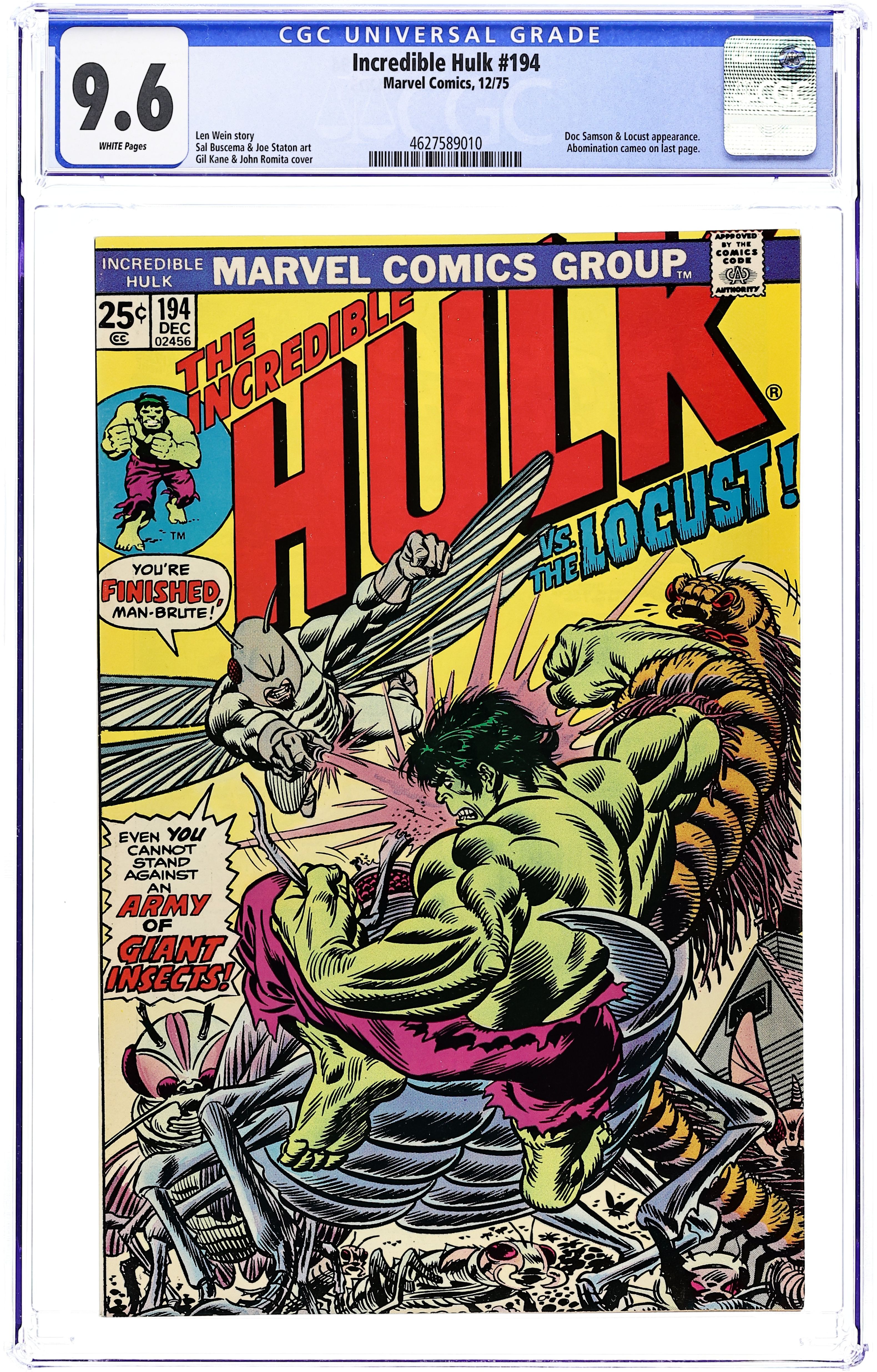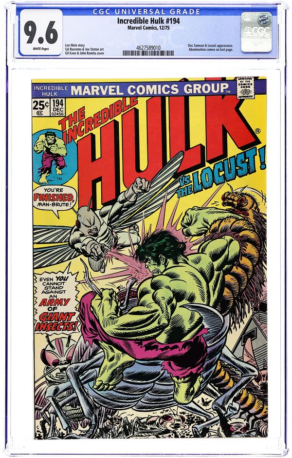 Cover pencils by Gil Kane, inks by John Romita. The Day of the Locust! starring The Hulk, Doc Samson, Thunderbolt Ross, Clay Quartermain, Betty Ross, Locust, and Abomination, script by Len Wein, pencils by Sal Buscema (breakdowns) and Joe Staton (finished art), inks by Joe Staton; Hulk helps a girl and her boyfriend flee from her super villain father. Story continues from Iron Man Annual 3. 36 pgs. Cover price $0.25. Grade: CGC 9.6 explanation of grade Condition: Used (collectible)