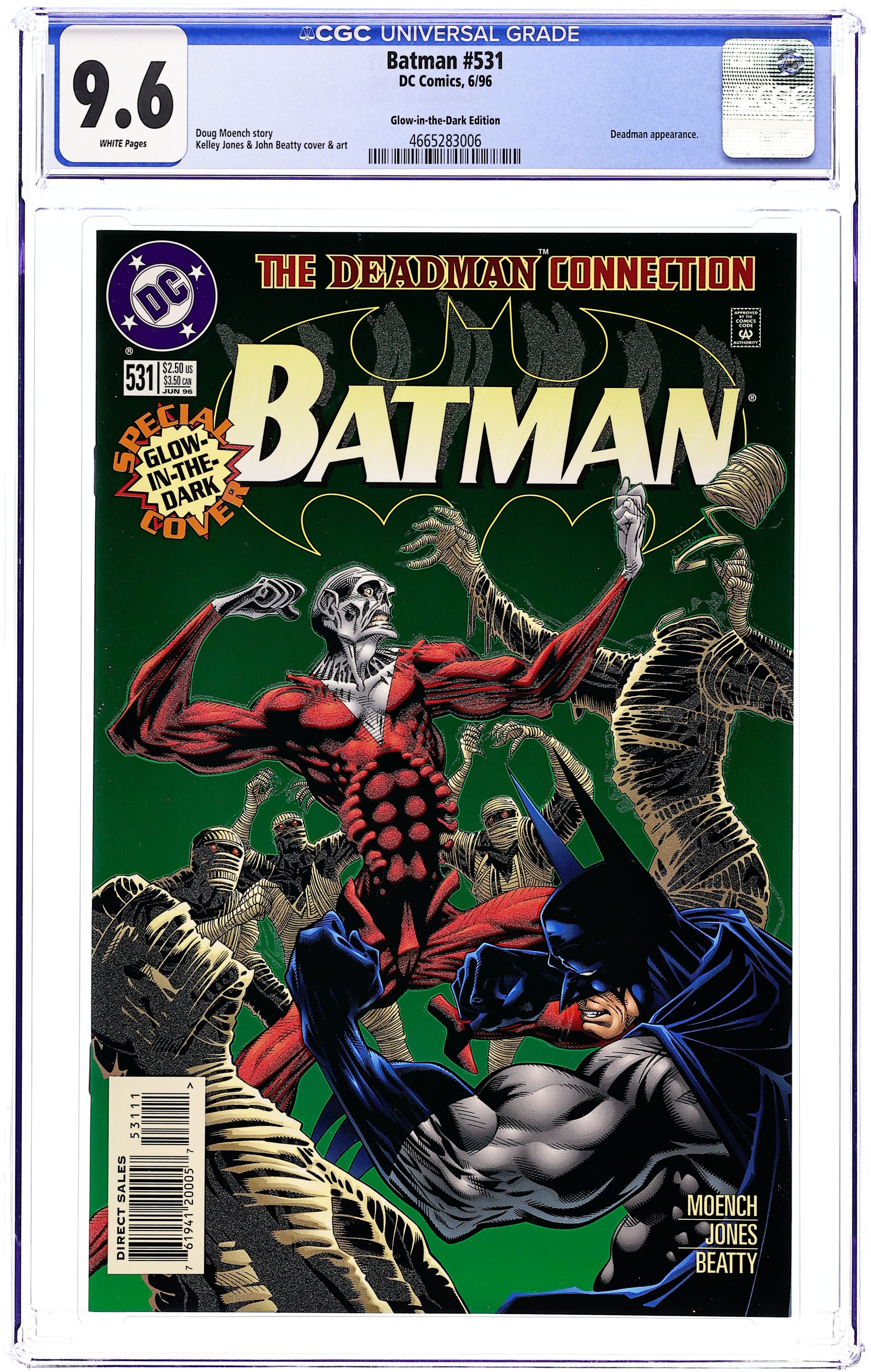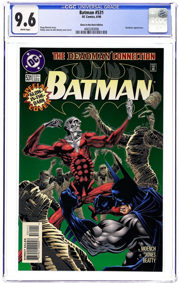 Starts Dec 15 Glow-in-the-Dark Edition Cover by Kelley Jones and John Beatty. The Deadman Connection Part 2 of 3: Cult of the Mummy - Written by Doug Moench. Art by Kelley Jones and John Beatty. The Dark Knight and special guest star, Deadman, take their investigation to Peru, where they battle an army of mercenaries who have enslaved the native population! 32 pages, full color. NOTE: As noted in the letters column of #534, some key dialogue was garbled on page 4 of #531, and word balloons were out of sequence in the last panel of page 18. On page 4, Bruce Wayne should have said: "It may be that all the subatomic particles in existence are interconnected, forming a single universal and non-local consciousness of which any one piece contains all the information required to replicate the entire universe, just as any living cell contains all the non-local genetic information necessary to clone an entire new organism." And the correct sequence of page 18's dialogue is: BATMAN: "Put your arms around my neck, Brand - and hold on tight!" DEADMAN: "No way on a first date, pal." BATMAN: "They're coming - and there's no other way across." DEADMAN: "Hey, you ain't the only one who can swing through the air with the greatest of ease..." 36 Pages, Full Color. Cover price $2.50. Grade: CGC 9.6 explanation of grade Condition: Used (collectible)