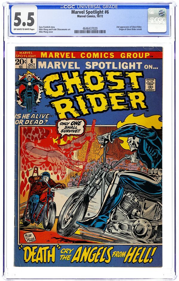 Starts Dec 22 Cover art by Mike Ploog. Angels From Hell, script by Gary Friedrich, pencils by Mike Ploog, inks by Frank Chiaramonte; Ghost Rider battles a gang of bikers called Satans Saints; after GR defeats them, their leader asks him to join the club; 2nd appearance of Ghost Rider (origin retold). 36 pages, full color. Cover price $0.20. Grade: CGC 5.5 explanation of grade Condition: Used (collectible)