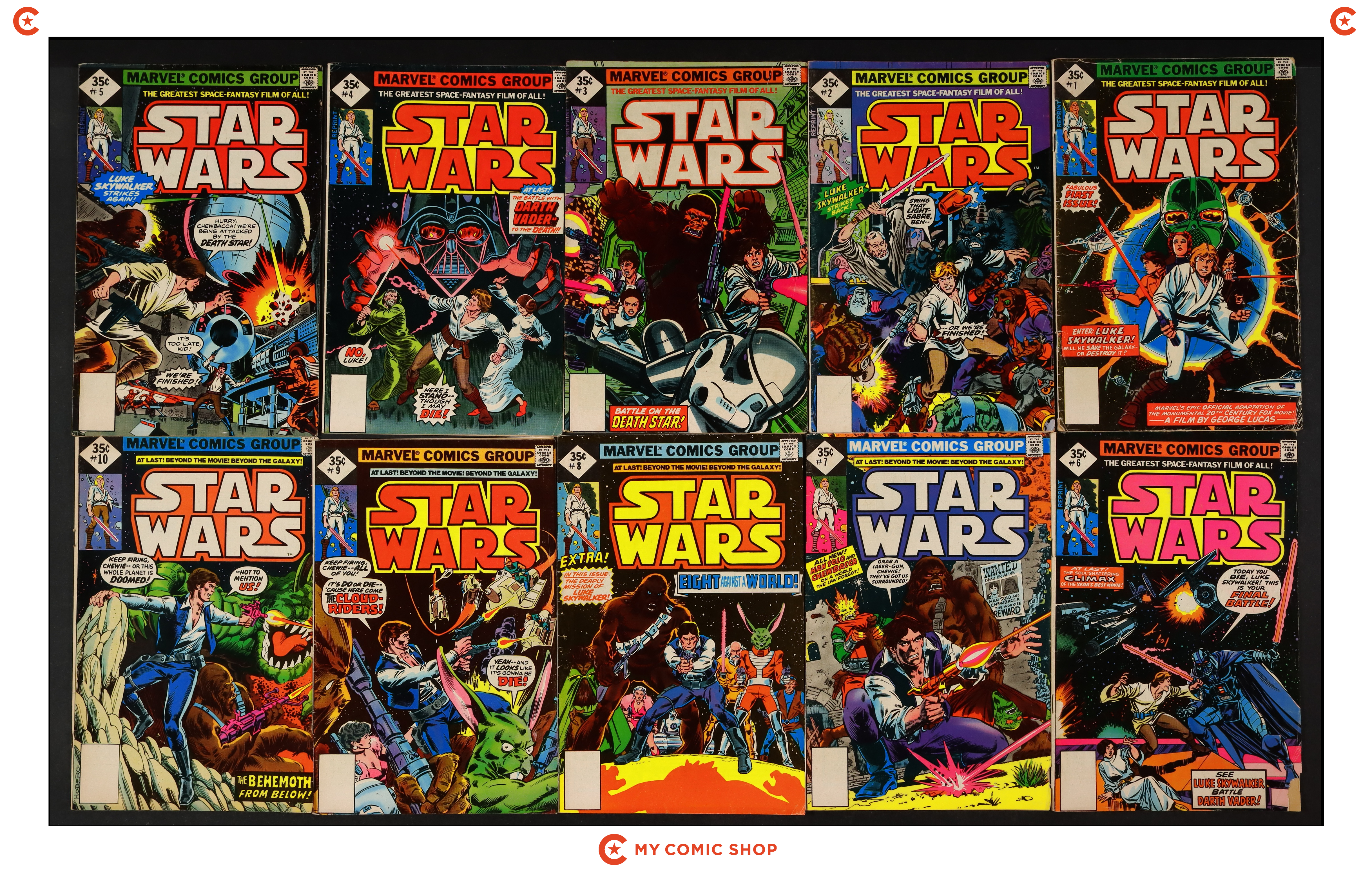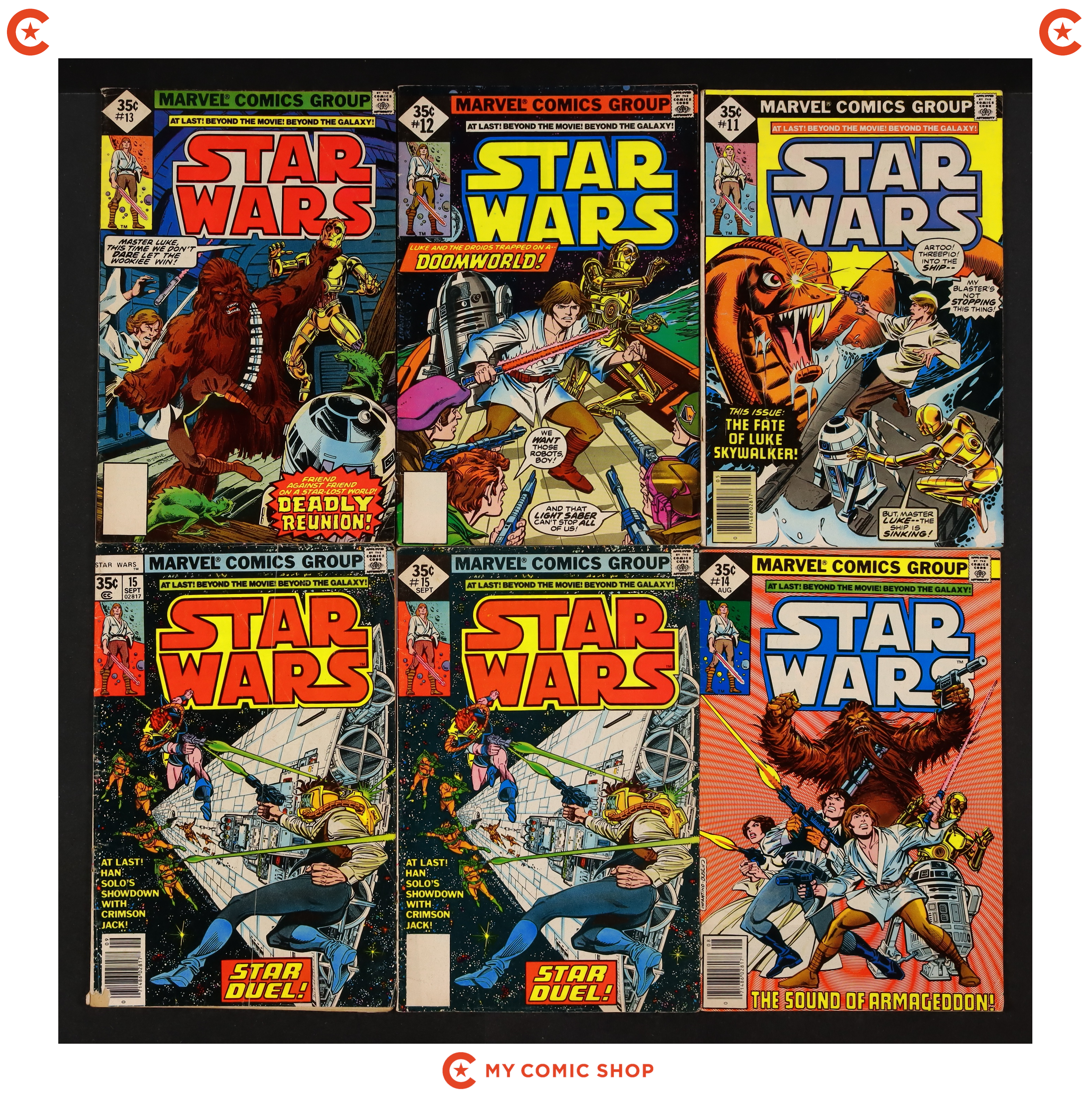 Issues 1DIAREP, 2DIAREP, 3DIAREP, 4DIAREP, 5DIAREP, 6DIAREP, 15 of Star Wars (1977 Marvel), and issues 7WHITMAN, 8WHITMAN, 9WHITMAN, 10WHITMAN, 11WHITMAN, 12WHITMAN, 13WHITMAN, 14WHITMAN, and 15WHITMAN of Star Wars (1977 Marvel) Whitman 3-Pack Diamond Variants. Most will grade in the GD to VG range.