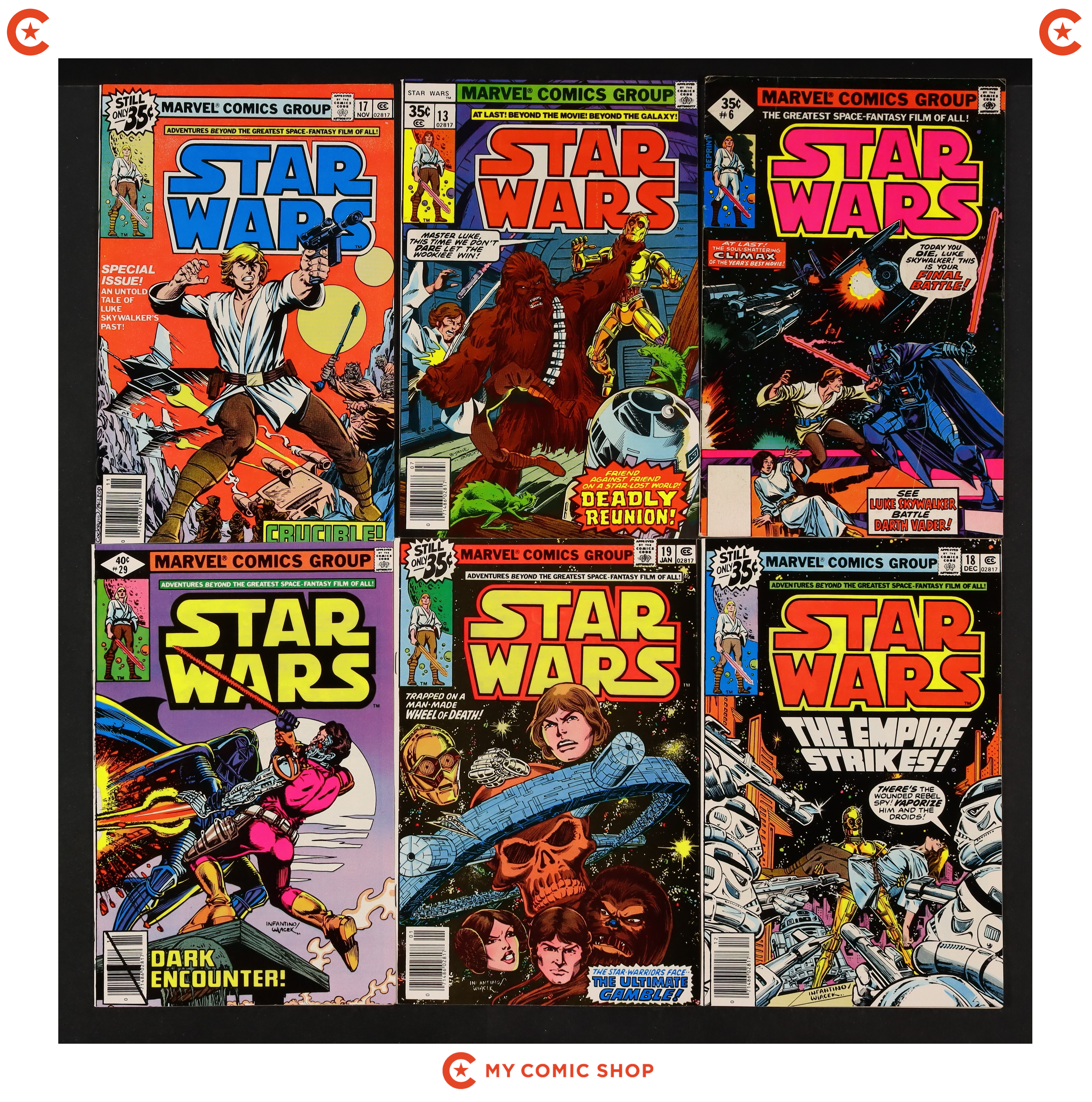 Issues 6DIAREP, 13, 17, 18, 19, 29D, 30, 38 of Star Wars (1977 Marvel), and issue 10WHITMAN of Star Wars (1977 Marvel) Whitman 3-Pack Diamond Variants. Most will grade in the VG to FN range.