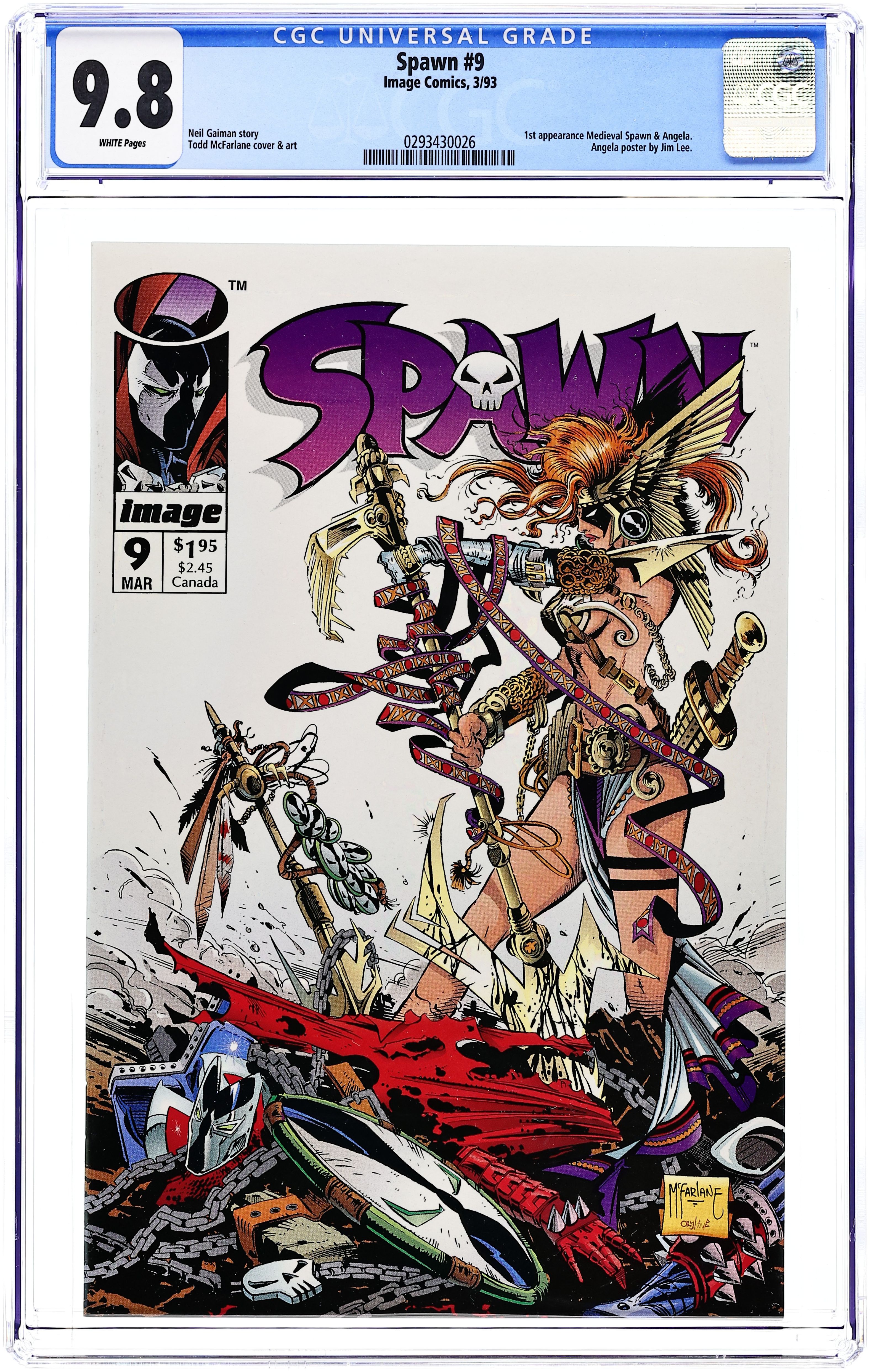 Direct Edition. "Angela!" 1st appearance of Angela, Cagliostro, and Medieval Spawn. Story by Neil Gaiman. Art by Todd McFarlane. Spawn is attacked by Angela, a warrior of Heaven who has been hunting Hellspawns for centuries. Includes a B&W poster of Angela by Jim Lee and Todd McFarlane. Cover price $1.95. Grade: CGC 9.8 explanation of grade Condition: Used (collectible)