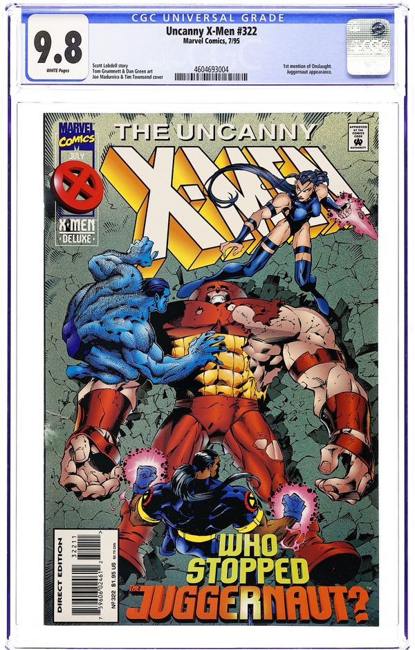 Deluxe Edition. Cover by Joe Madureira and Tim Townsend. Dark Walk, script by Scott Lobdell, art by Tom Grummett, Dan Green, Mark Pennington, Al Milgrom, and Matt Ryan; Charlotte shows Archangel a crime scene where mutants apparently killed humans during a hate crime; Jean talks to her dad about her dead sister; Wolvie tells Storm that his humanity is slipping away; Beast, Bishop and Psylocke are coming out of the movies (Pulp Fiction) when Juggernaut falls out of the sky in front of them; Juggy is disoriented, confused and very afraid of somebody called Onslaught. Statement of Ownership average # of copies in preceding 12 months: 723,067. 36 pgs., full color. $1.95. Cover price $1.95. Grade: CGC 9.8 explanation of grade Condition: Used (collectible)