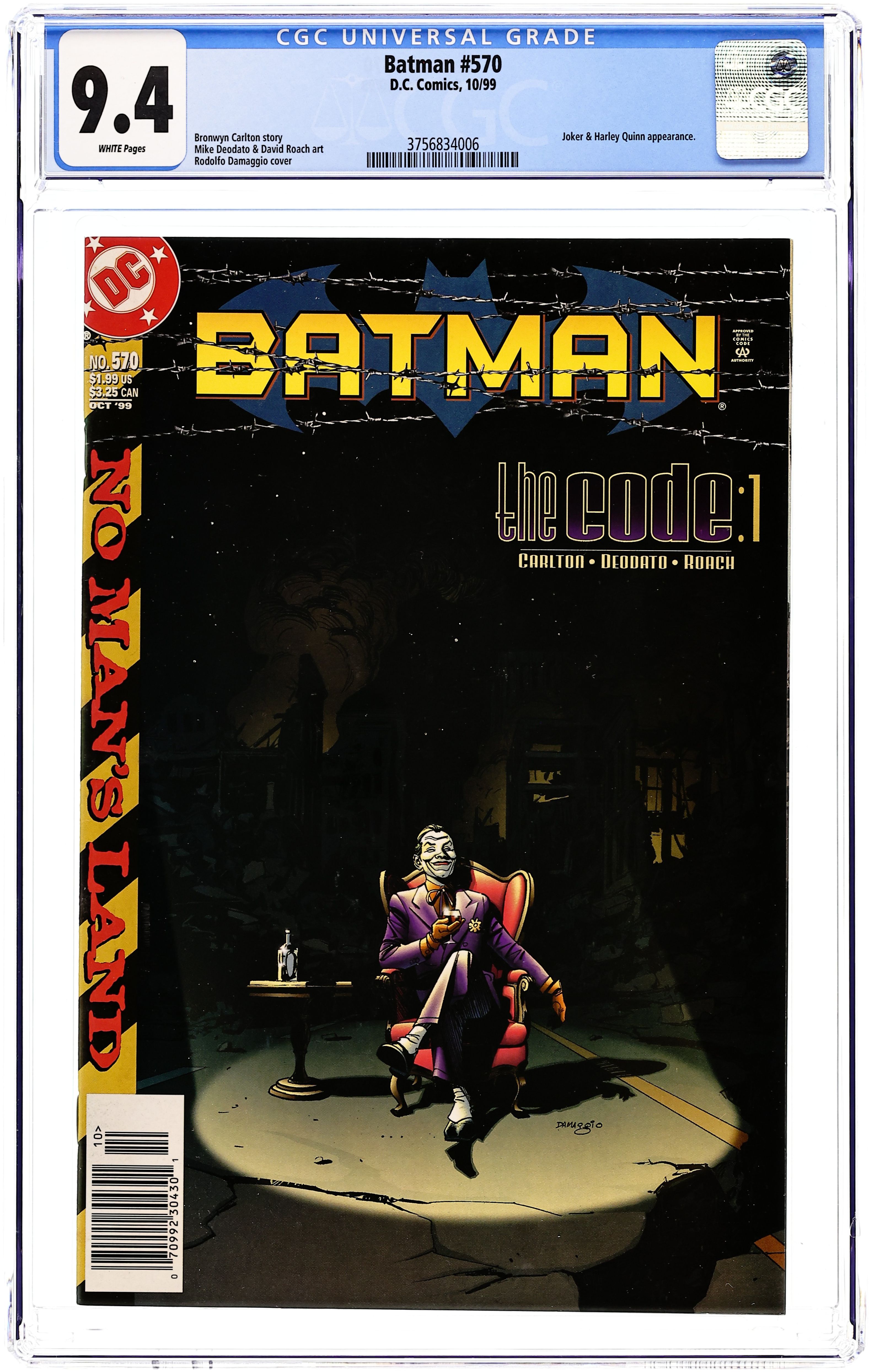 Newsstand Edition. Written by Bronwyn Carlton; art by Mike Deodato and David Roach; cover by Rodolfo Damaggio . Harley Quinn hits the streets of "No Man's Land" in Part 1 of the 2-part "The Code!" Following the events of BATMAN: HARLEY QUINN, Harley returns just as the Joker expands his turf over the broken bodies of two warring gangs. While she uses a philosophy called "The Code" to try to manipulate events to her liking, Joker makes a sweeping move that threatens to tip the balance of power in Gotham and change the face of "No Man's Land" forever. 40 Pages, Full Color. Cover price $1.99. Grade: CGC 9.4 explanation of grade Condition: Used (collectible)